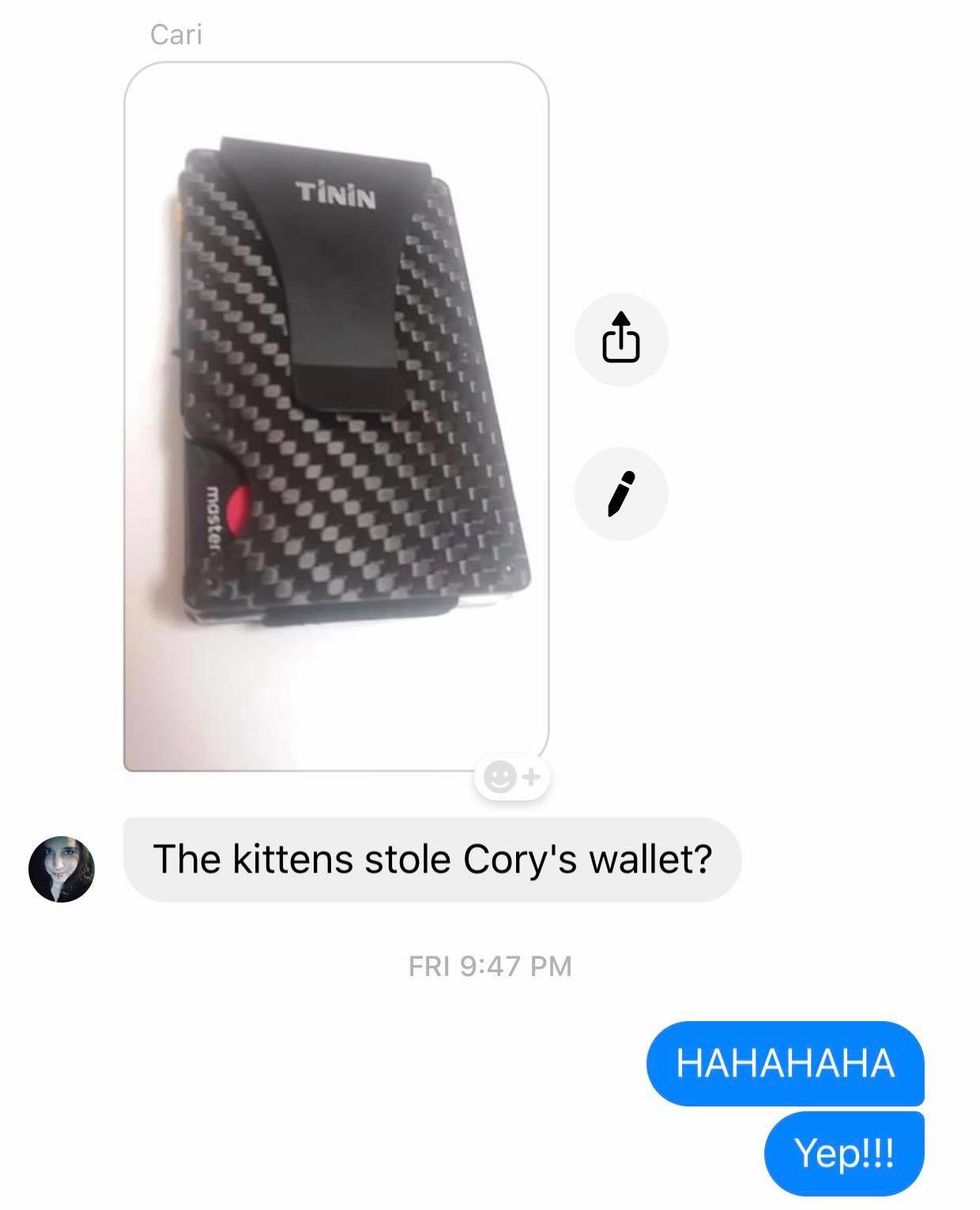 She saw the kittens inspecting a wallet that belonged to someone. Apparently, they had stealthily taken it out of Cory's pocket while he was cuddling with them.