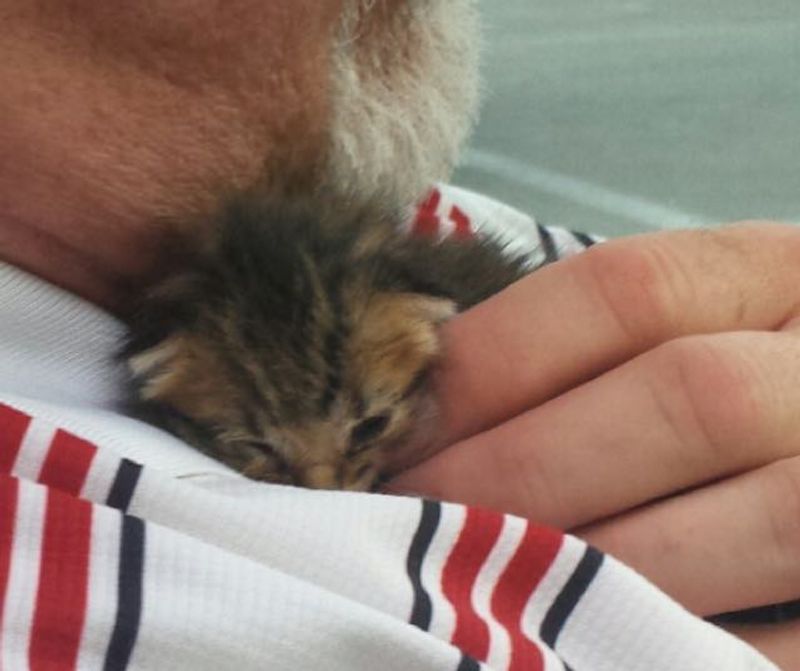 "We didn't know if the kitten was gonna make it for awhile. My dad carried the kitten in a pouch around his neck while he worked and fed him from a bottle," imgur user @shirleytempleblackmetal shared with Love Meow.
