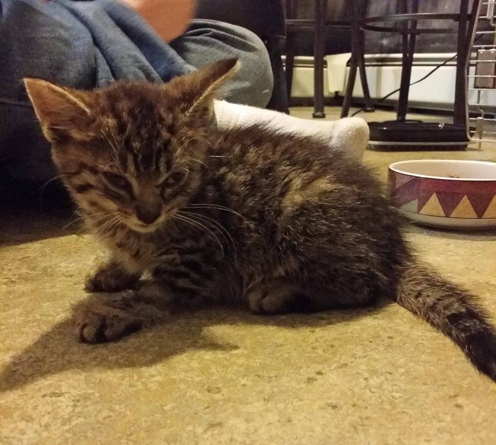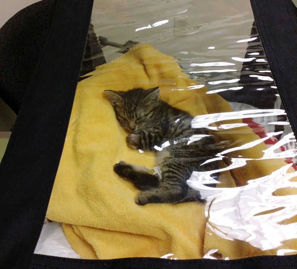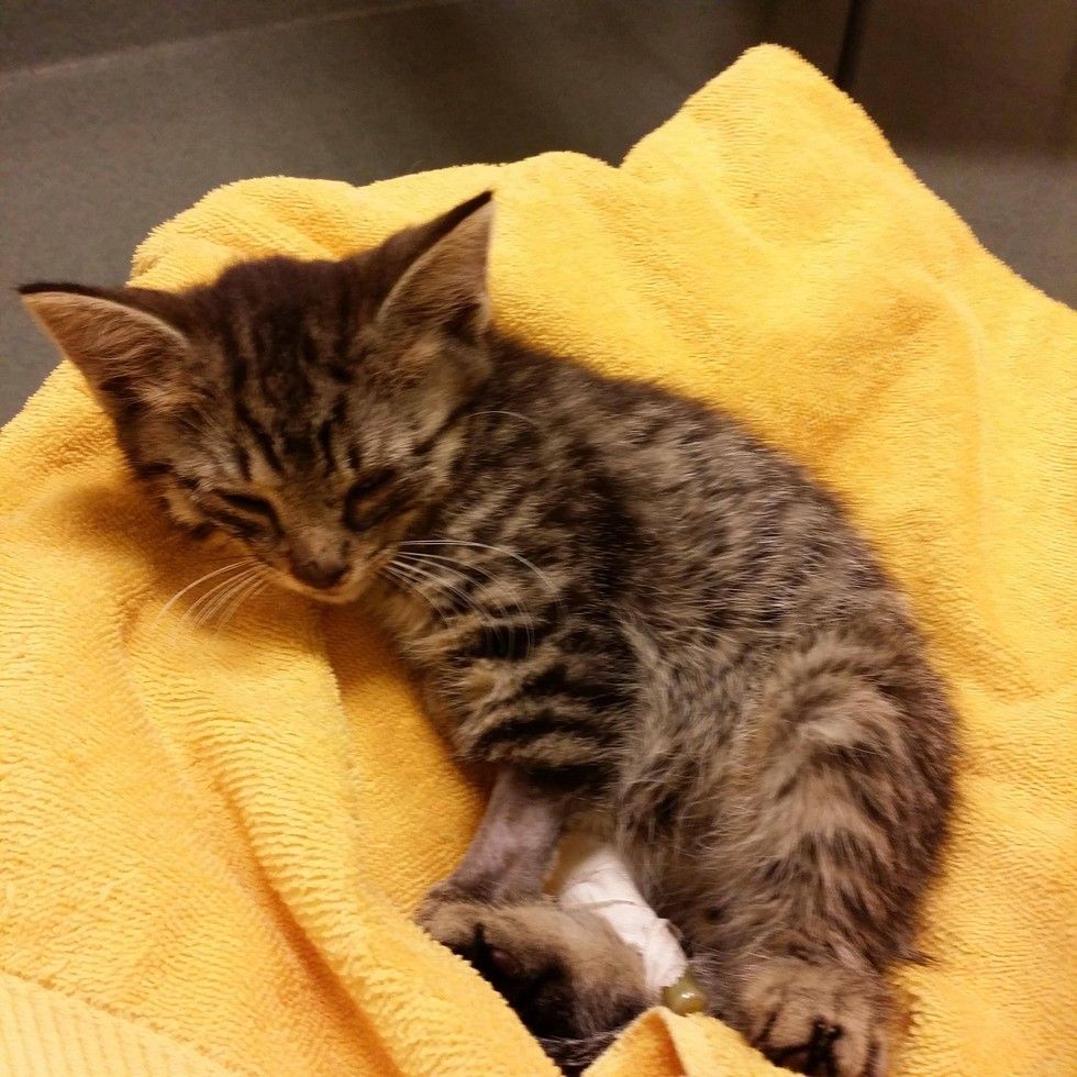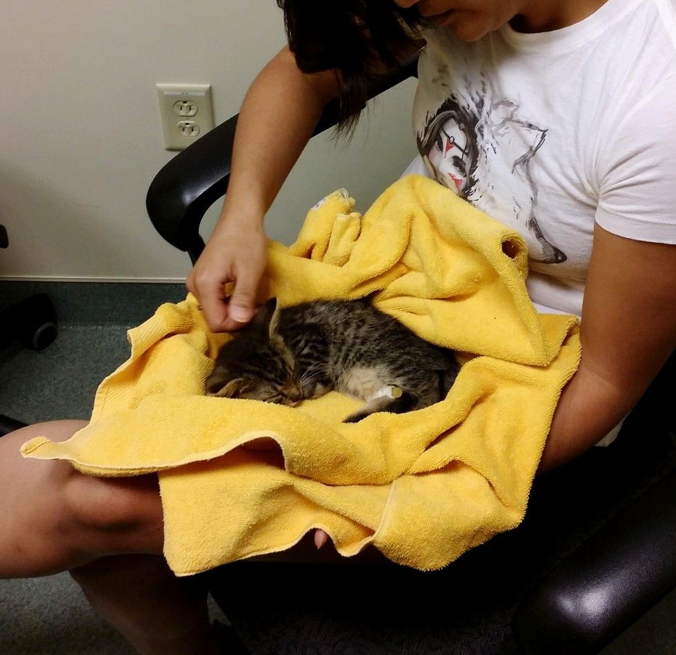 He stayed with the kitten at the ER until the vet told him that the tabby would need to stay overnight due to the trauma and injuries.