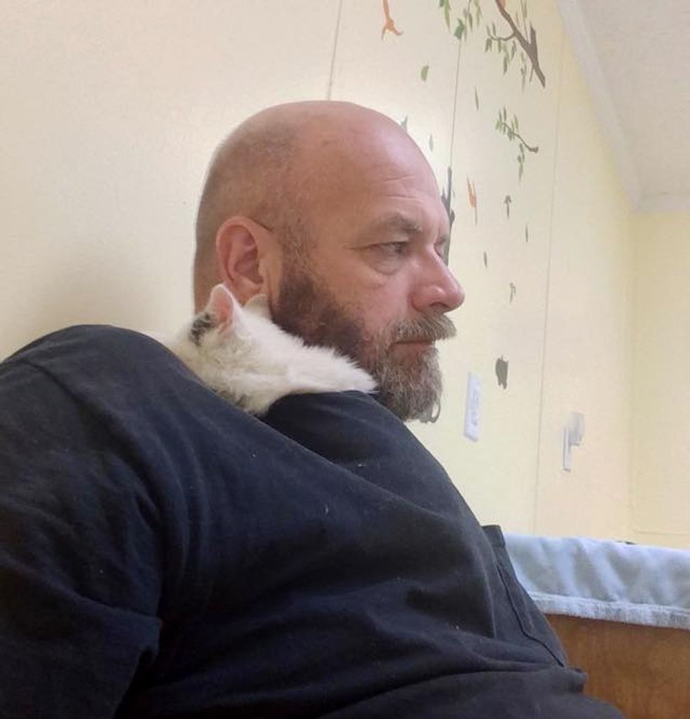 At the vet, the kitten snuggled into his shirt while waiting for the vet.
