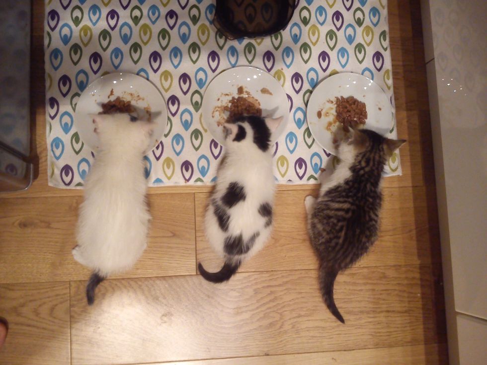 The kittens were so hungry that when they were given food, they just scarfed it down.