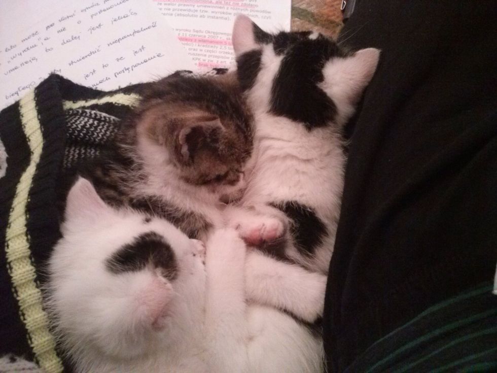 "My dad found those three hiding in the corridor (lucky for them, he left the front door open). They were about two months and they were most likely born feral because they were pretty dirty, hungry and scared of humans," Zosia Fąfara told Love Meow.