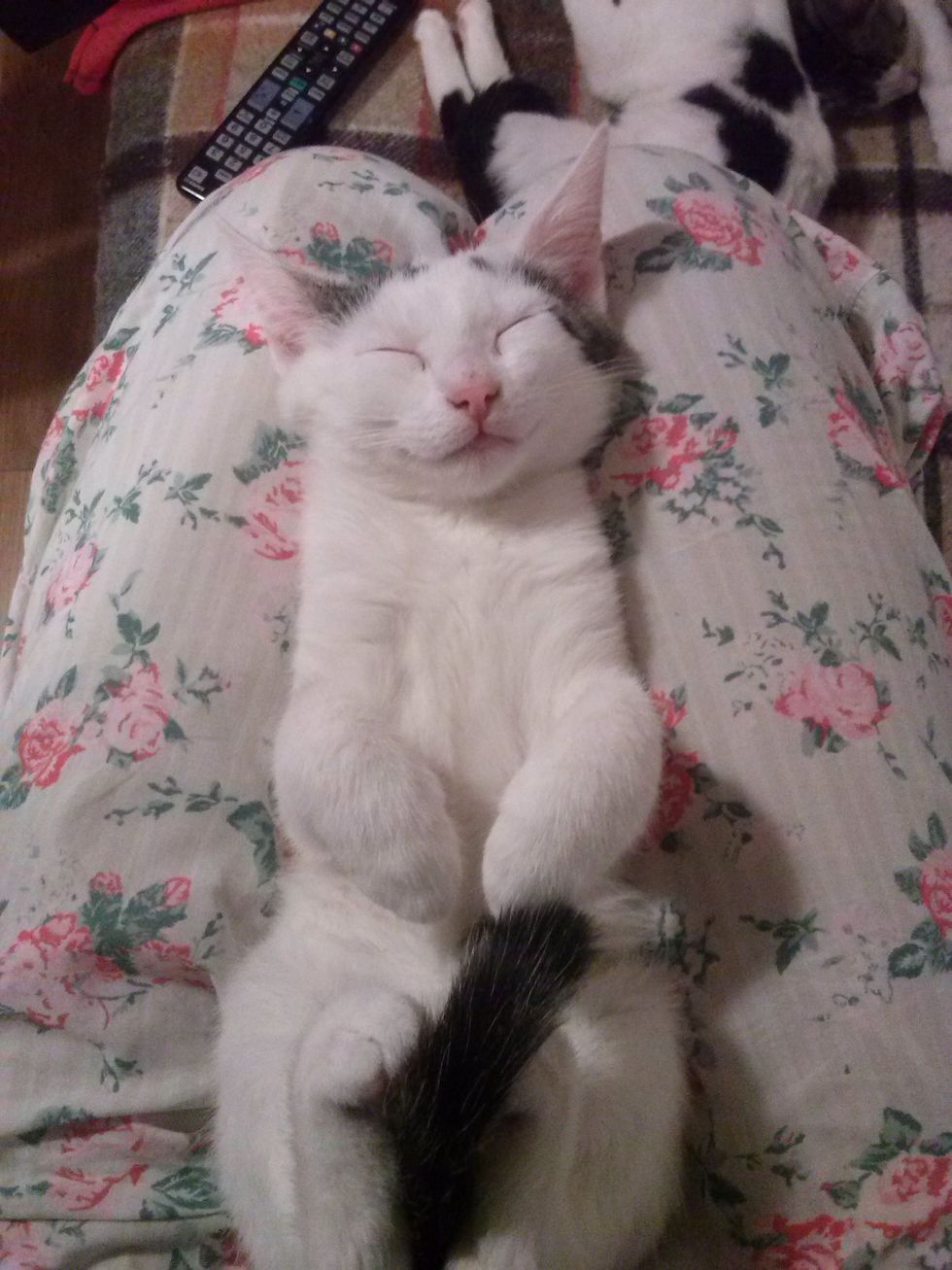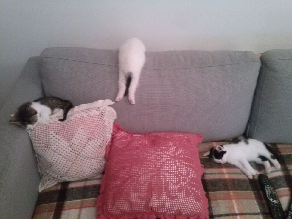 After a long day of playing, the feline siblings were completely tuckered out on the couch.