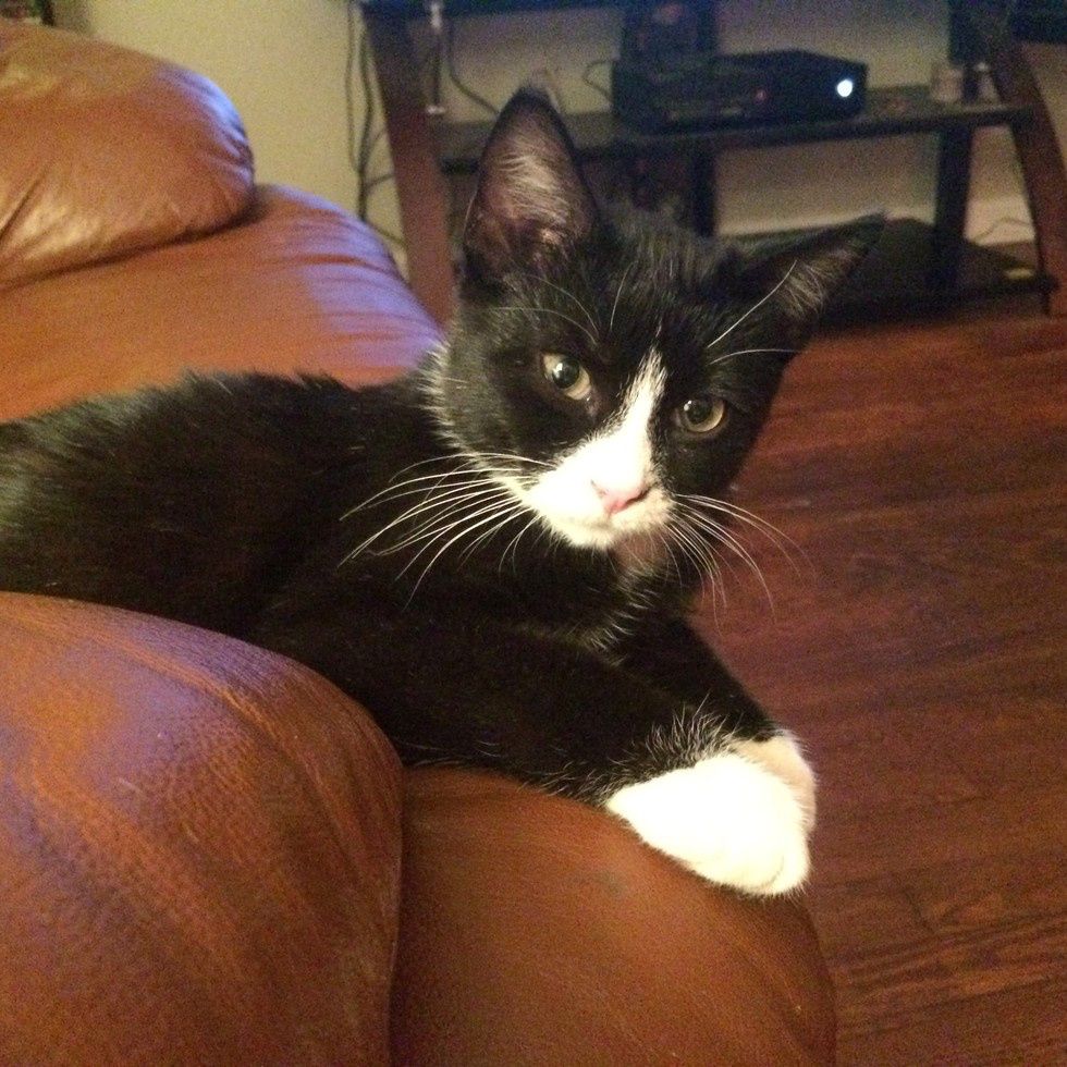 The kitten was discovered all alone. When he found Matt, he became imprinted on him, tagging along with him wherever he went. The tuxedo wanted to go home with his human friend, so Matt scooped him up and took him home.