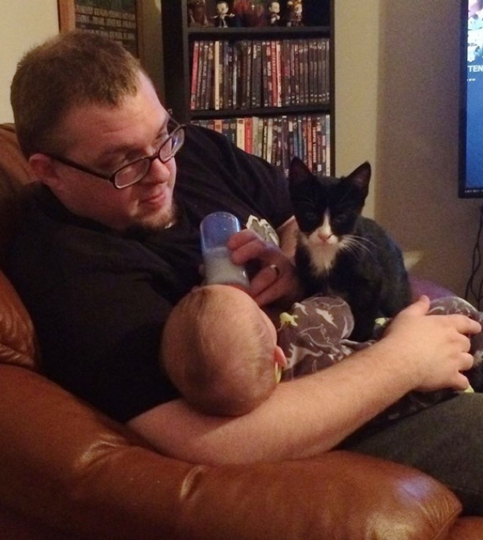 After a trip to the vet, the 12-week-old kitten got a clean bill of health. Not only did he fit right into his new home, but he became quite attached to their tiniest person in the family.
