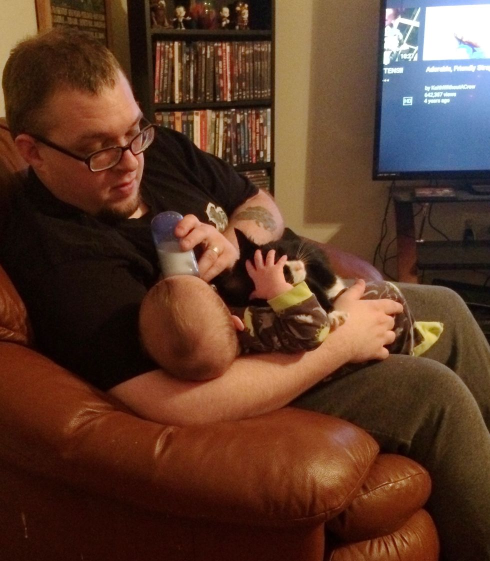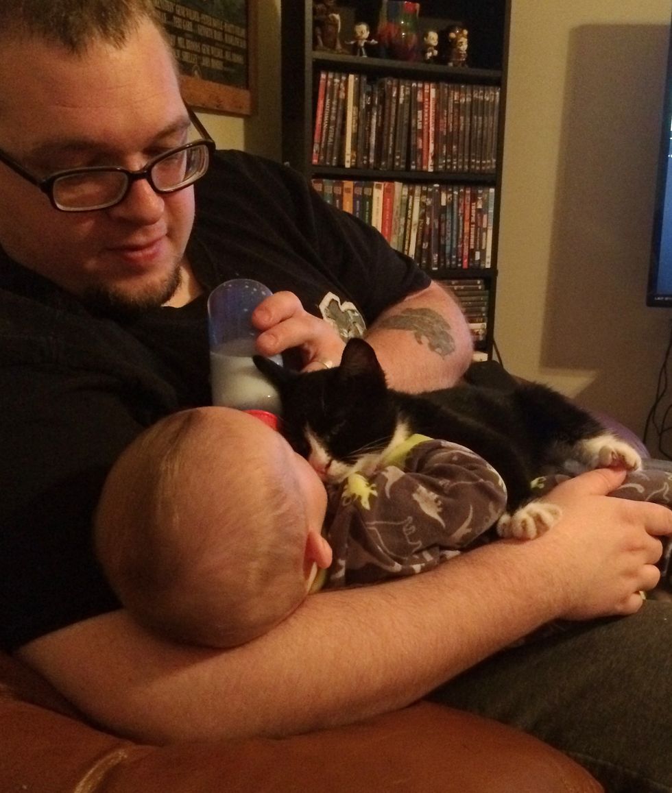 When Matt sat down to give his son Rowan a bottle, Doug decided that he would "help".