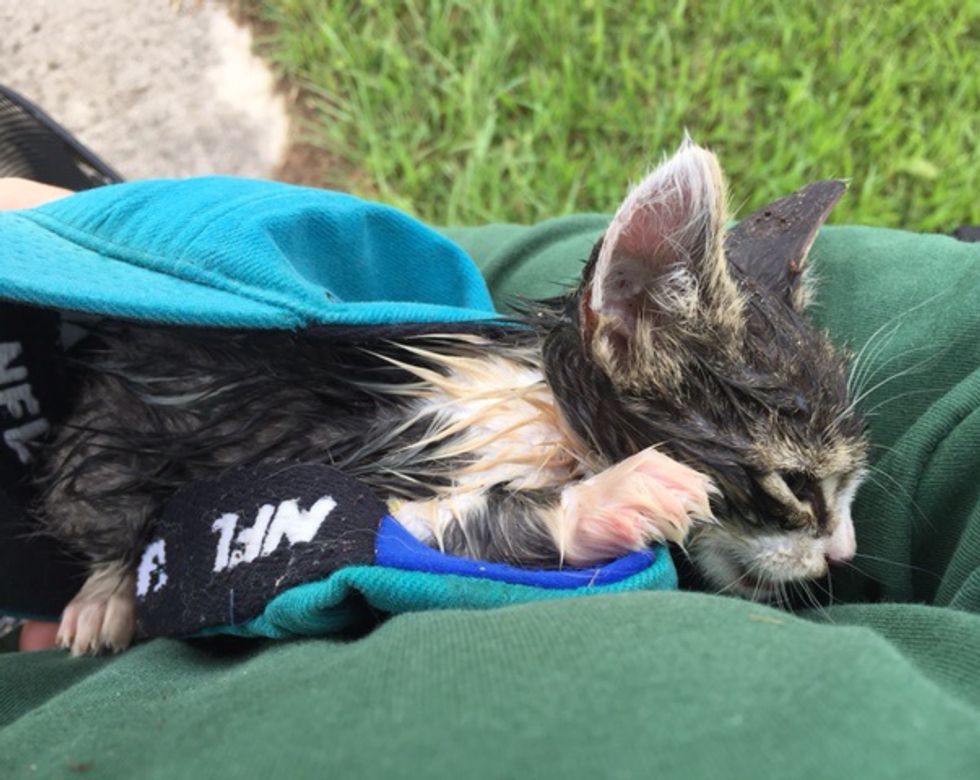 Chad immediately picked up the kitten from the puddle and put him in his baseball cap trying everything he could to keep the little one from fading. While he was riding back home, he held the kitten securely in his cap, telling him to stay strong.