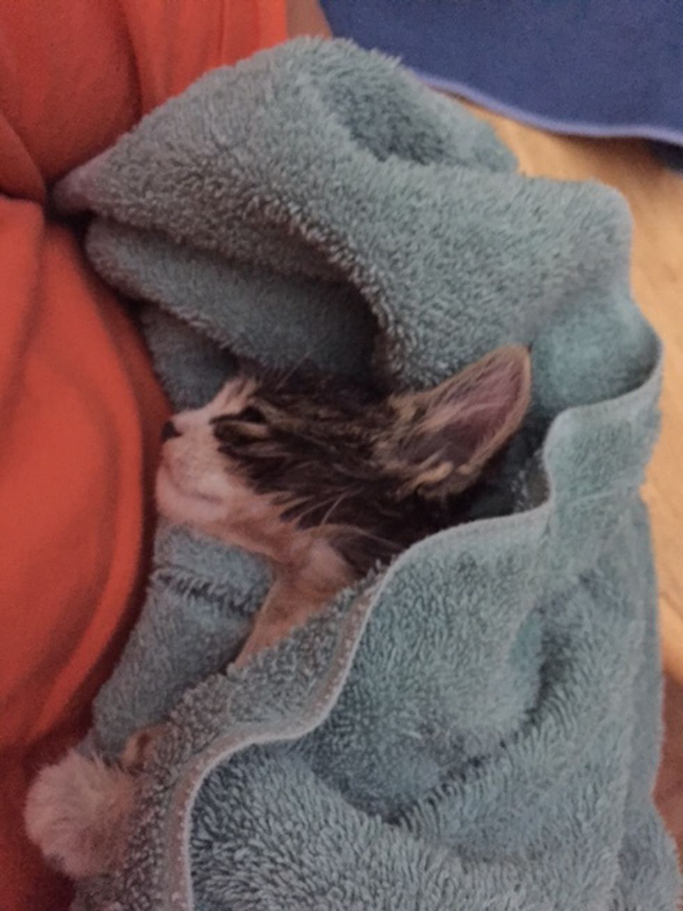 The kitten was dangerously cold, so Carre quickly started drying him off and getting him warm again with towels. At some point, they thought they had lost him, but the couple refused to give up. About two hours into their revival efforts, they saw a sign of life coming back into that tiny body.