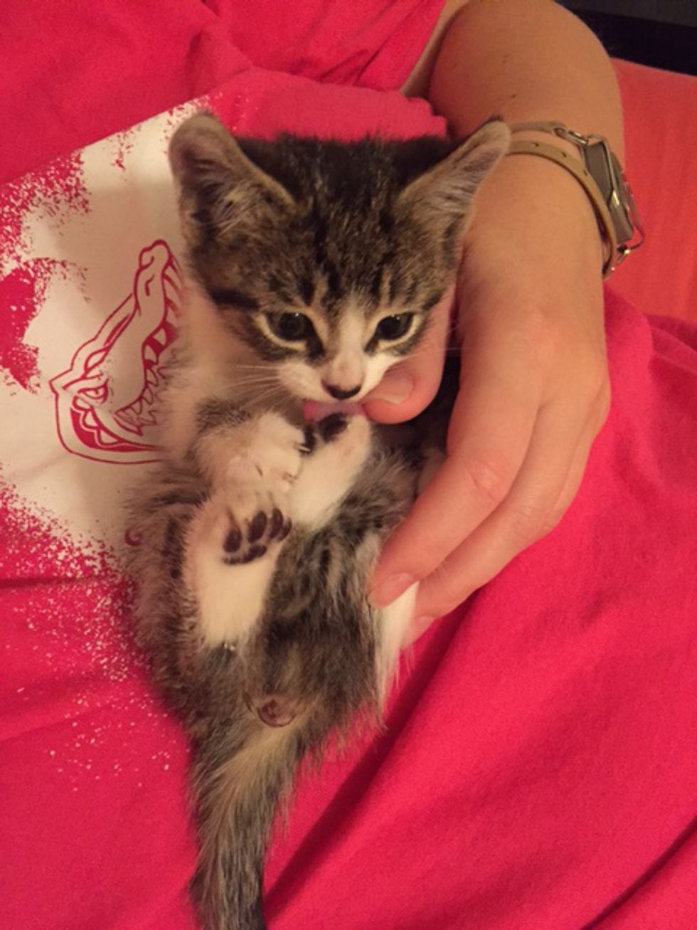 "He was severely hypothermic, very malnourished, but with a heck of a will to live! Amazing what being warm, dry and getting some good grub can do for a kitten!"