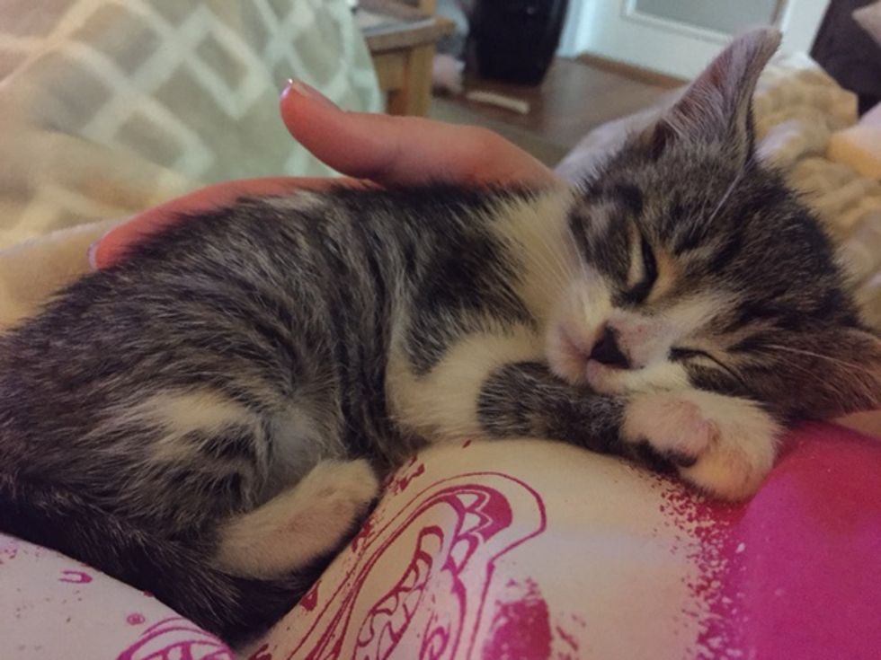 The little kitty no longer needs to worry about food and shelter. He is now snuggling with his forever humans in the comfort of a loving home.