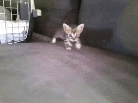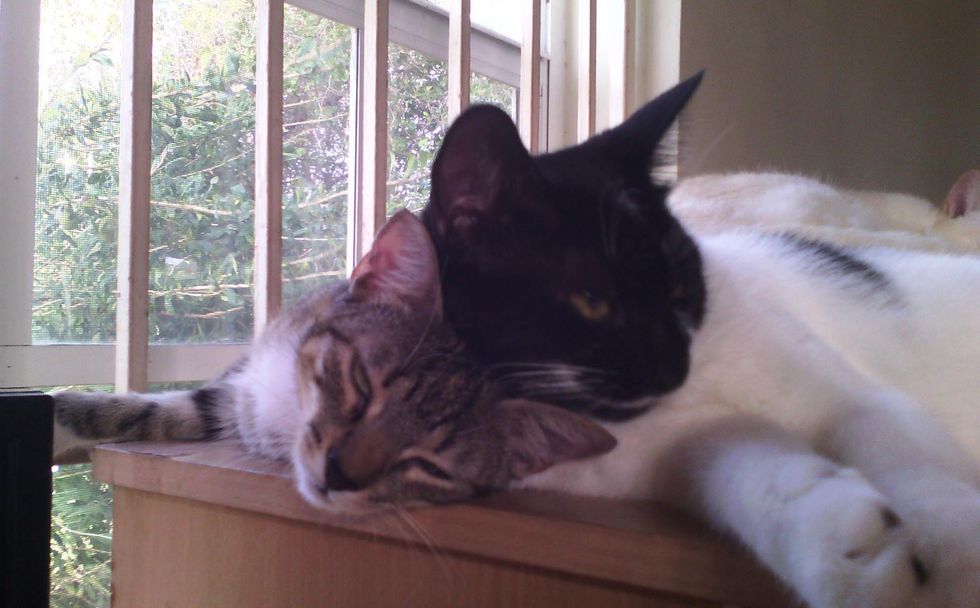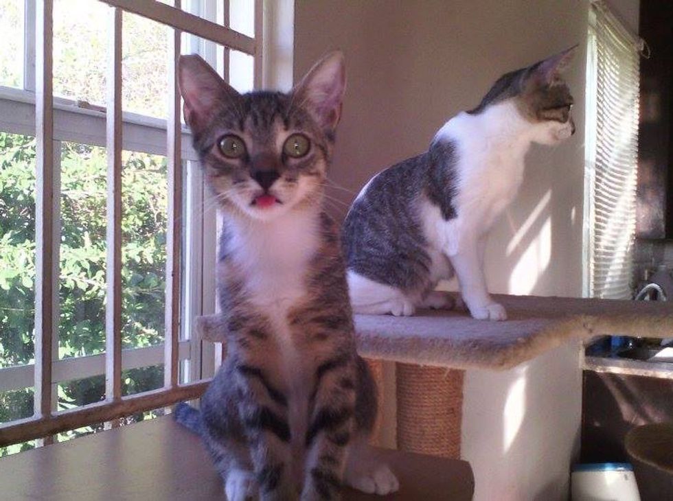 The tabby girl is now the same size as mama (in the background) and her personality has really shone through.