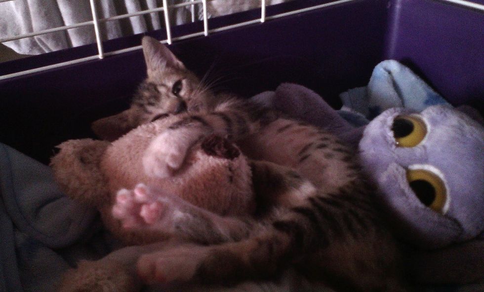 At the time Mariette had just taken in a mama cat and her one surviving kitten, so she introduced Gizzy to them. Right away the cat mom took to the scrawny little kitten and started nursing her as her own. Her own kitten Bella was happy to have a new sister. The two instantly bonded.