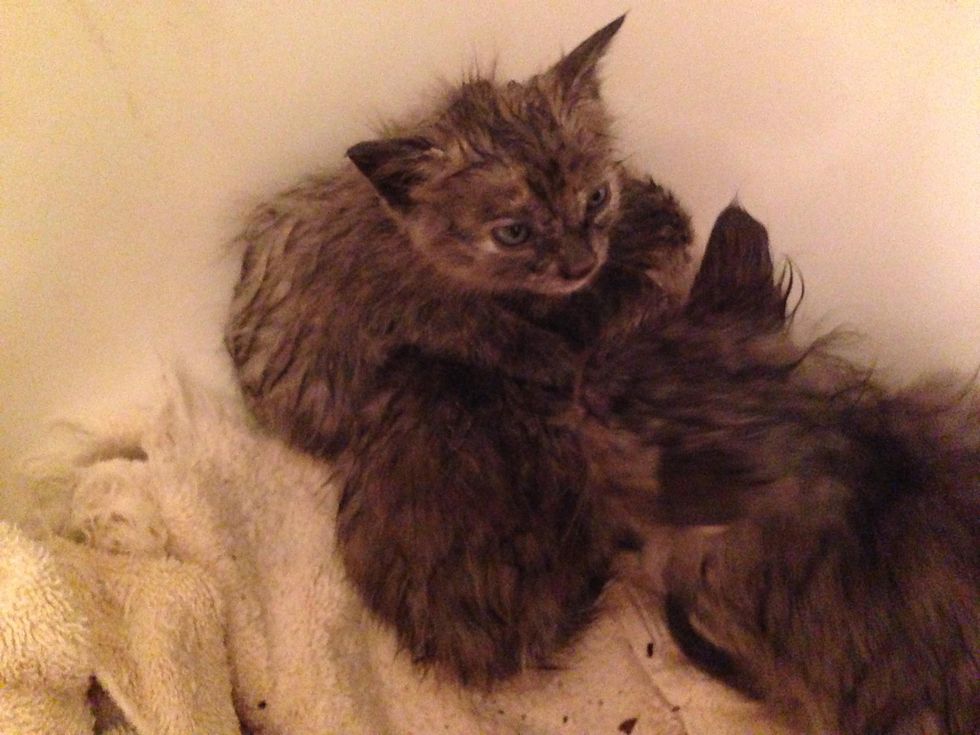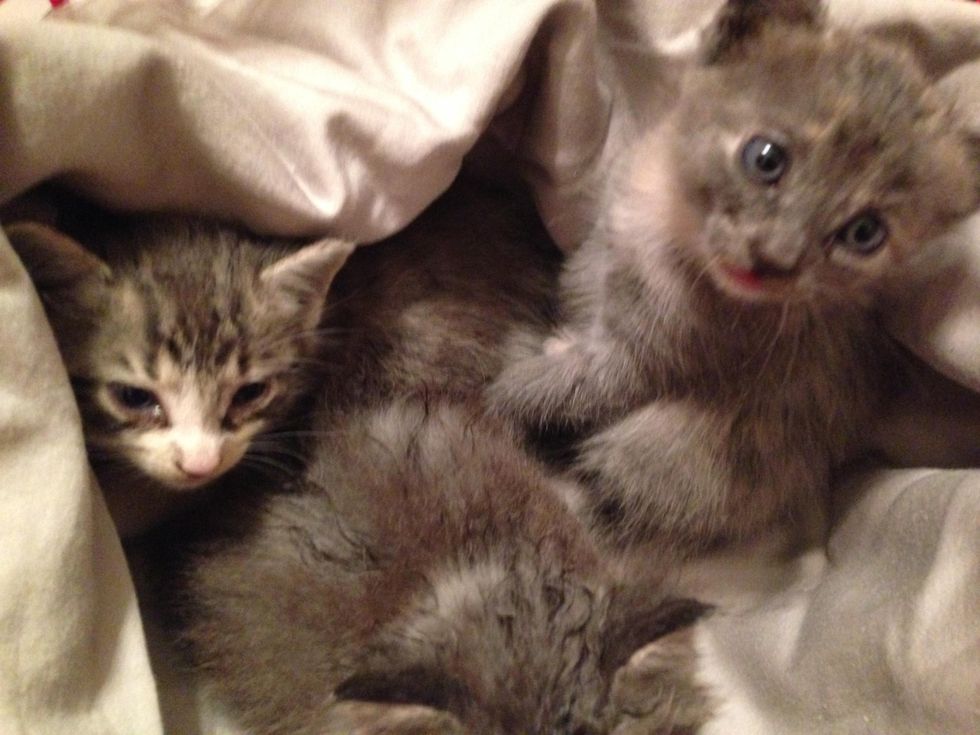 He grabbed the kittens, brought them inside his house, cleaned them up and wrapped them in a warm towel. The kittens stopped crying and started purring while snuggling in their new warm bed.