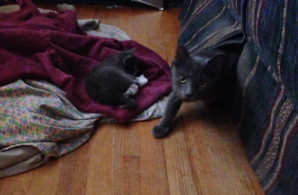 The kittens immediately went up to their mama for a meal, and the sweet momma gave them baths as they were nursing away.