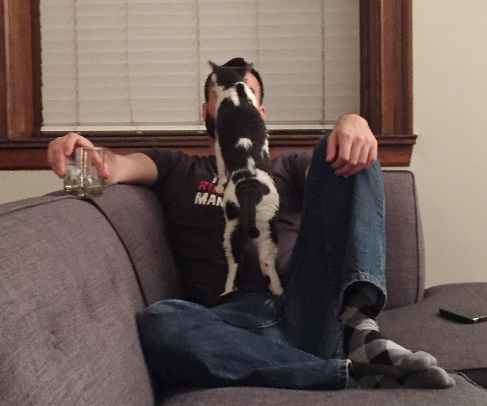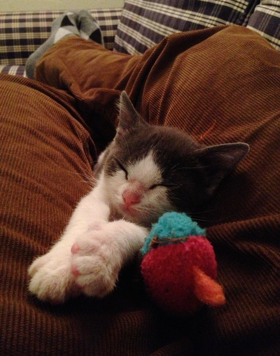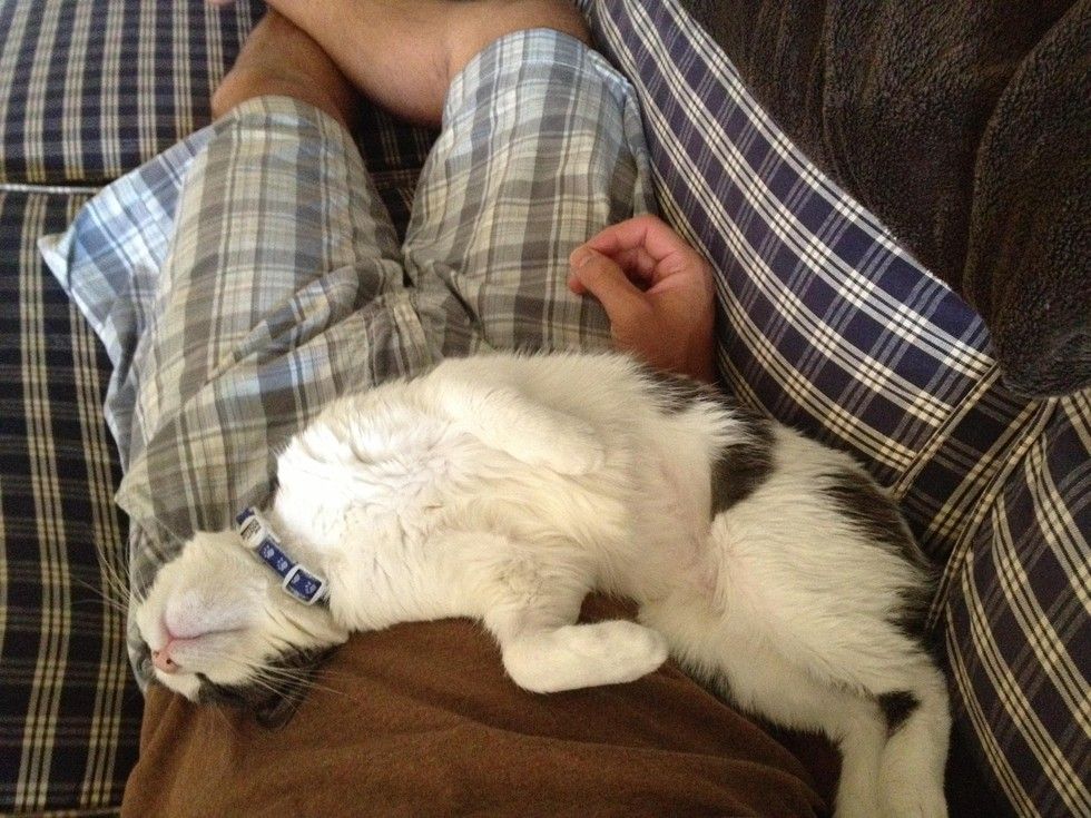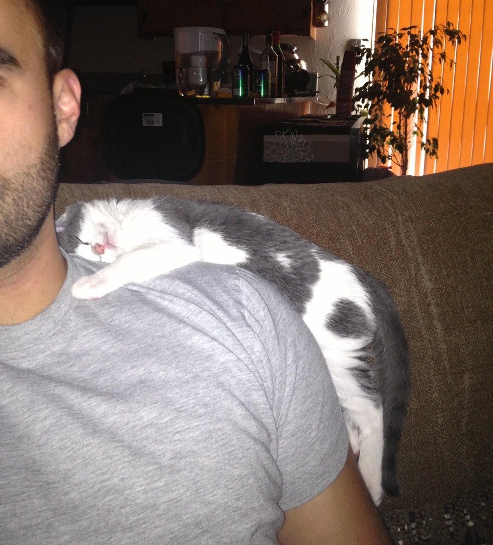 Whenever he sits down, the kitten hops on his lap and conks out.