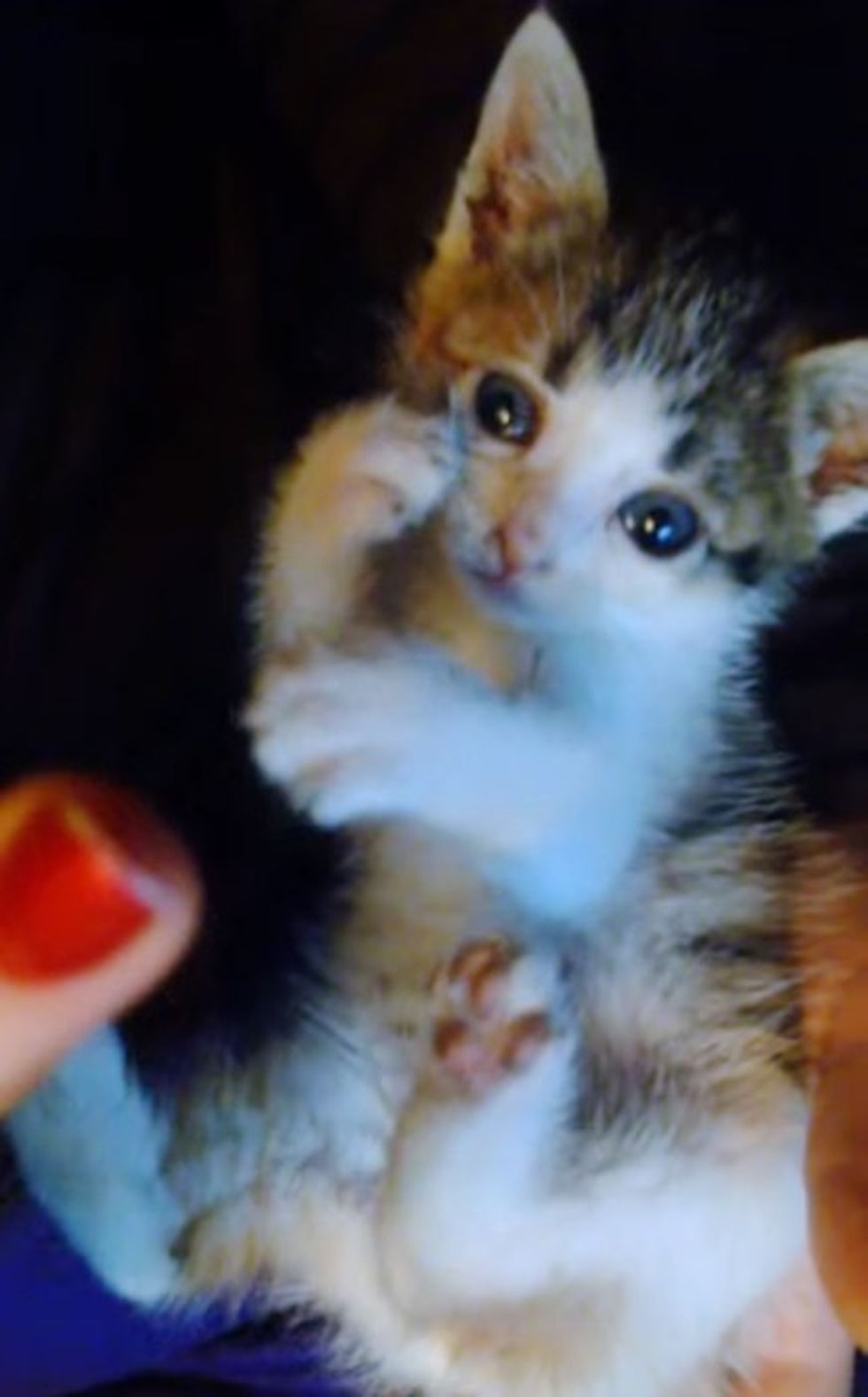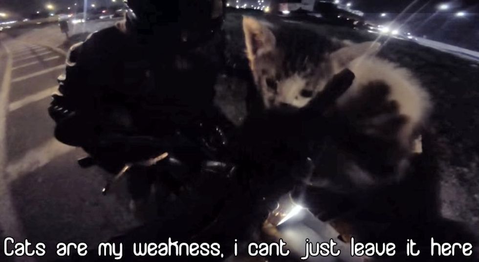 Two bikers spotted a little homeless kitten trying to cross a busy street. They immediately slowed down, and one of the bikers scooped up the kitten from being run over but he couldn't take her. Desmond Shephard approached the man who had the kitten and offered to help.