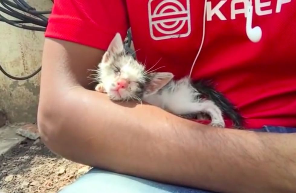 He gave her something to drink as the kitten was very dehydrated, and petted her gently to give her the comfort that she needed to hang on. It was then the kitten looked up to him and began to purr.