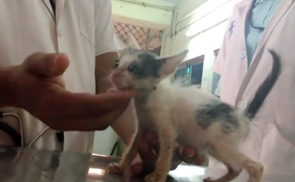 A little scrawny kitten was found on the roadside near the drainage. She was very afraid but couldn't muster the energy to move let alone run away due to hunger and fatigue.