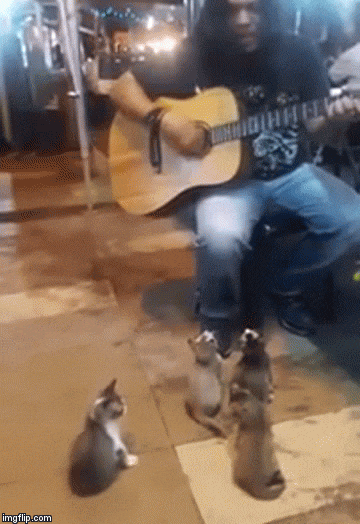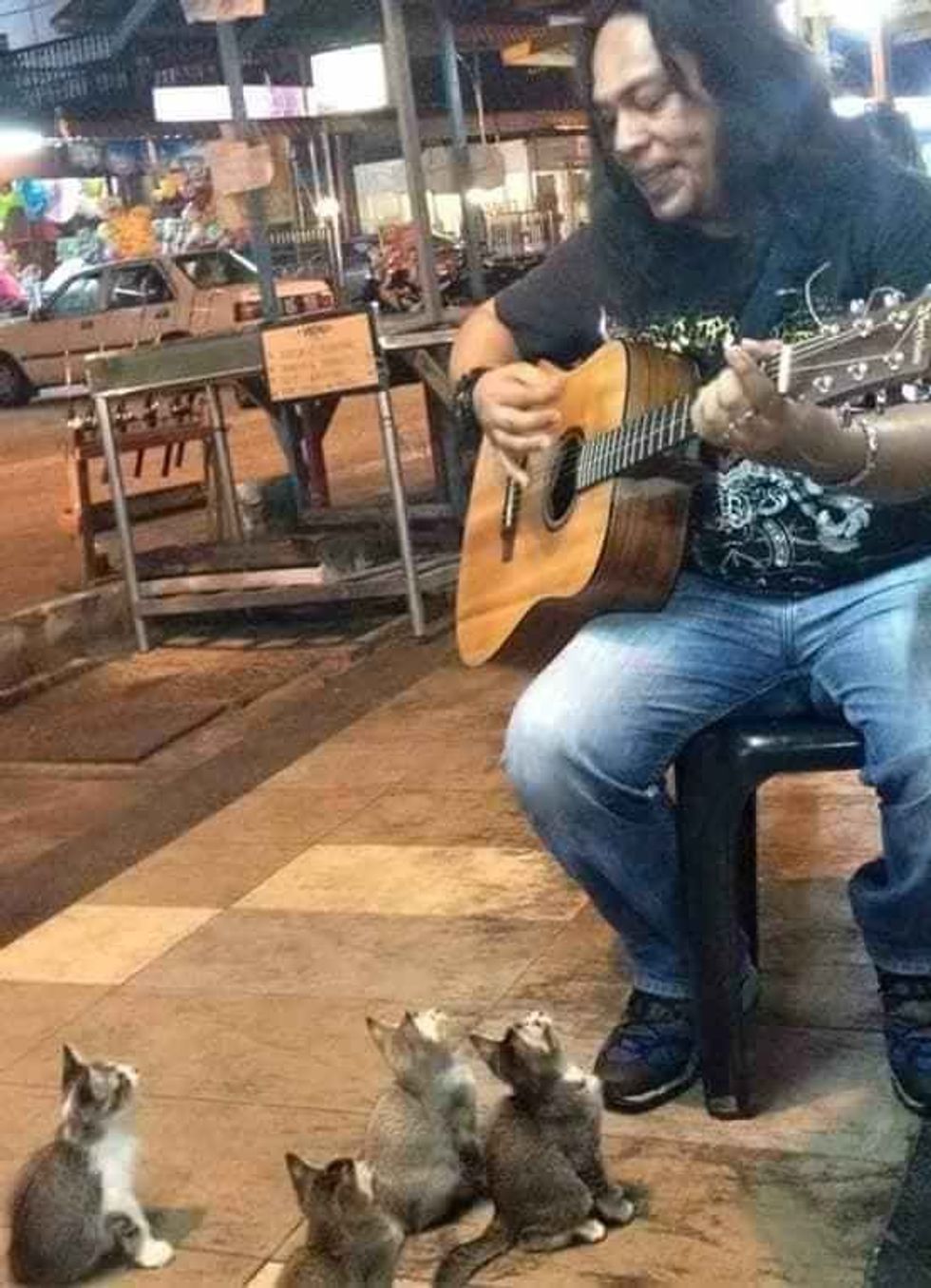 This man serenades to a small group of music loving kittens. Four kitties come gather around in front of a musician when he plays the guitar and sings on the streets of Pangkor, Malaysia.
