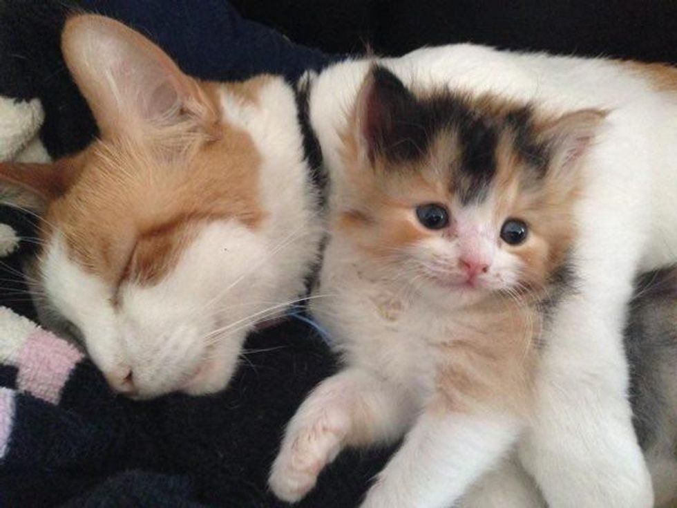One of the cats that adopted her looks just like Fluffy! She has taken to her like her own.