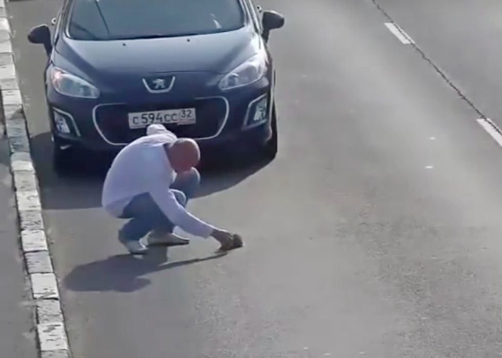 That's when a man in a Peugeot stopped. He got out of his car and began to approach the kitten.