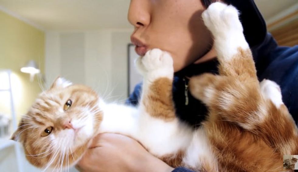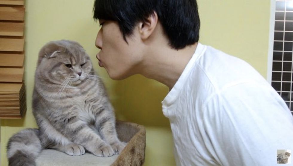 This cat loving man has five fluffy kitties that he loves to bits. Sometimes he likes to show his affection to his cats with a kiss, but not everyone is into it.