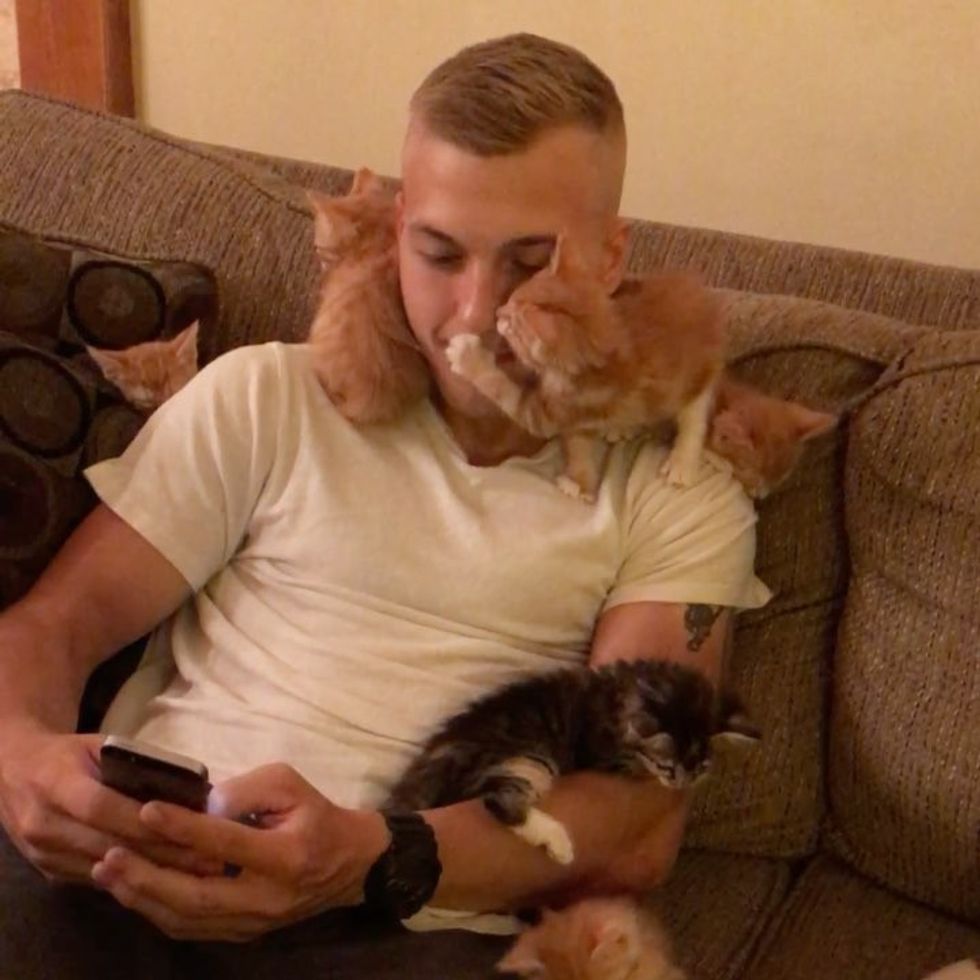That day Spencer spent hours on the couch with kittens purring and draping all over him.