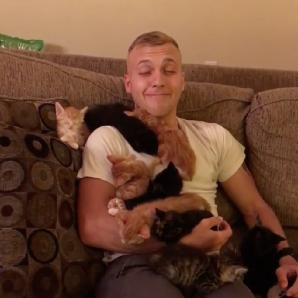The ten fur babies turned him into a cat dad on the spot. Spencer was overjoyed by the love from the clowder of furballs.