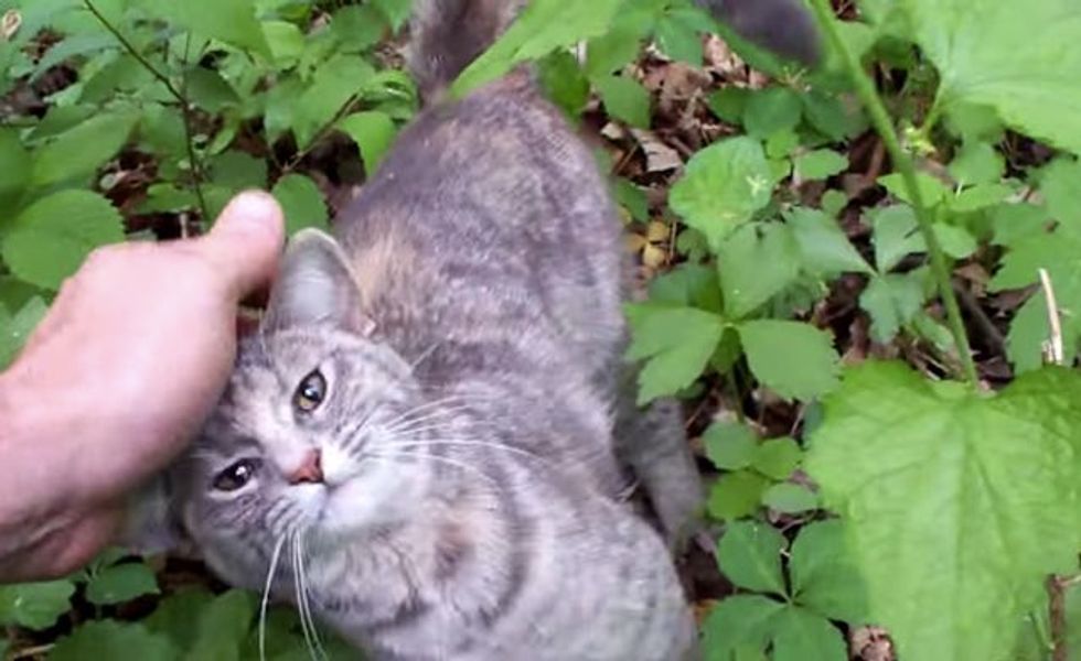 When Dave was walking in the woods, he heard meowing from the weeds. As he looked over, he saw a friendly cat walk up to him and start following him around.