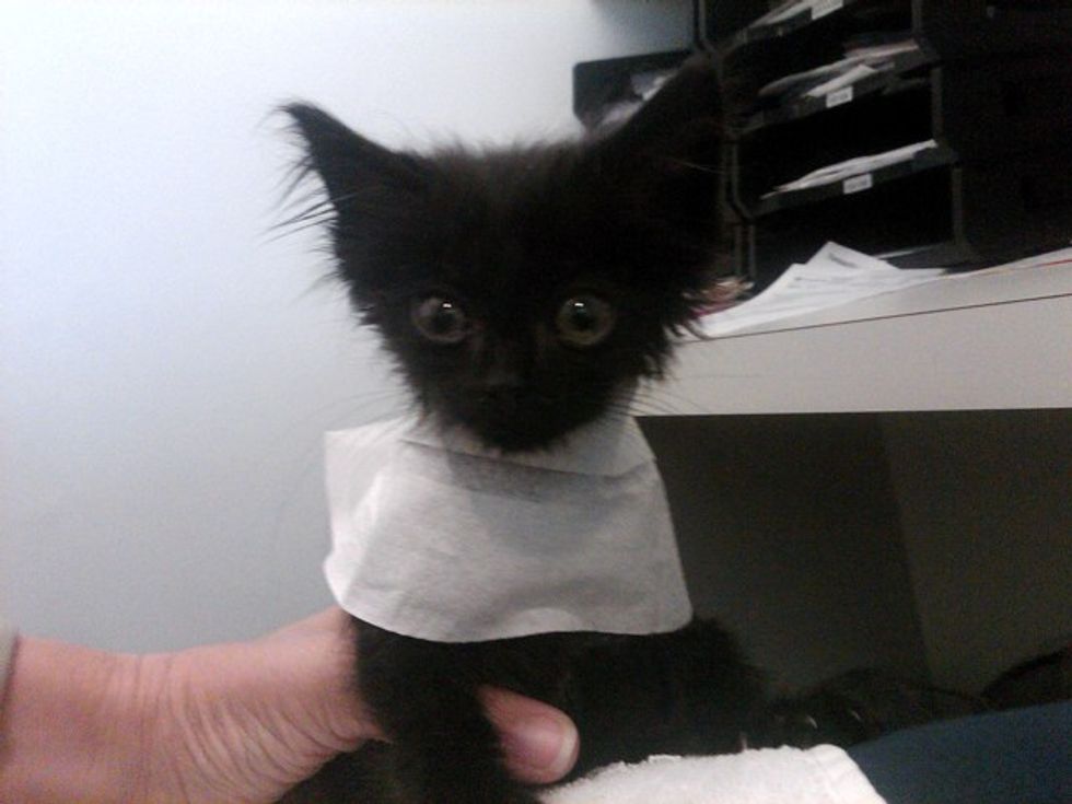 "Here he is at my office with his napkin bib on for a syringe feeding, one of his most famous photos"