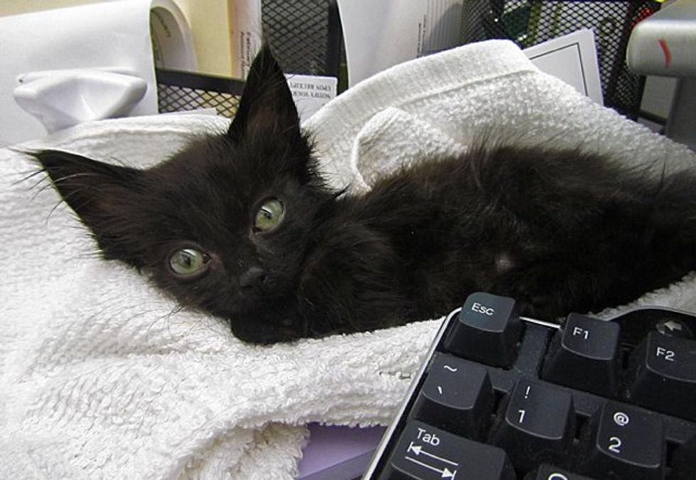 "Marco was rescued by Annie, of Kitty Loft. He was 1 of 5 kittens nursing from a mama who had a broken leg and only weighed 4 lbs. Needless to say, their mom was not providing her FIVE kittens with the nutrients they desperately needed, so the kittens had a rough start. 2 did not make it, 2 did very well and Marco was in bad shape. He was half the size (14 oz) of his sisters (30 oz) and not eating at all," said Stephanie from Big City Little Kitty. "I asked if I could take him for a bit as I can take him to work and provide round the clock care, syringe feeding and a close eye. It worked!"