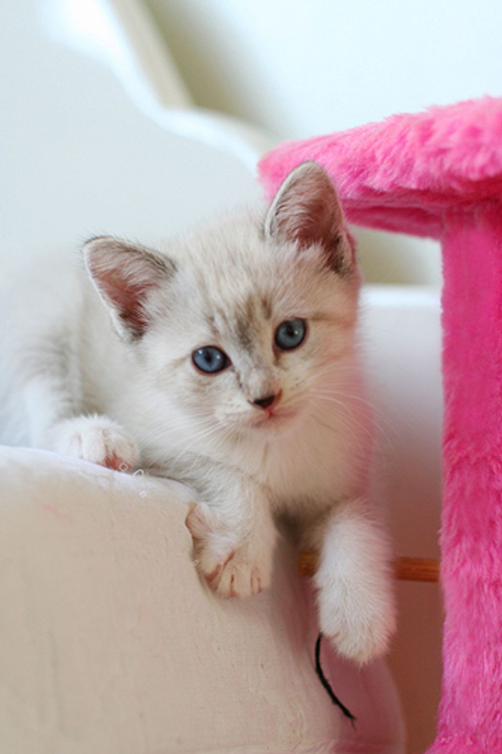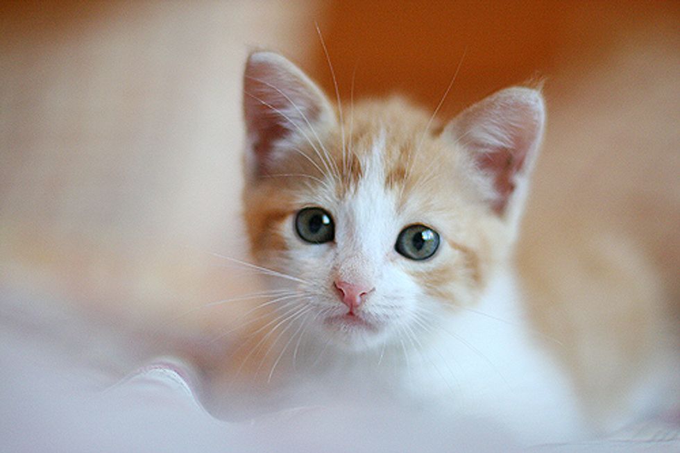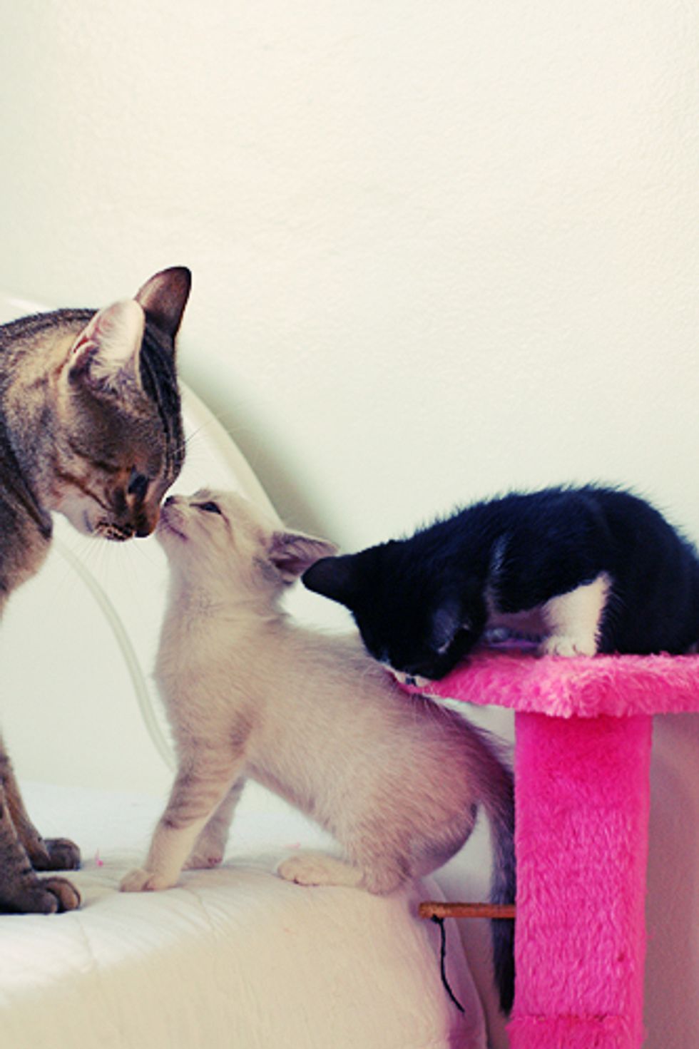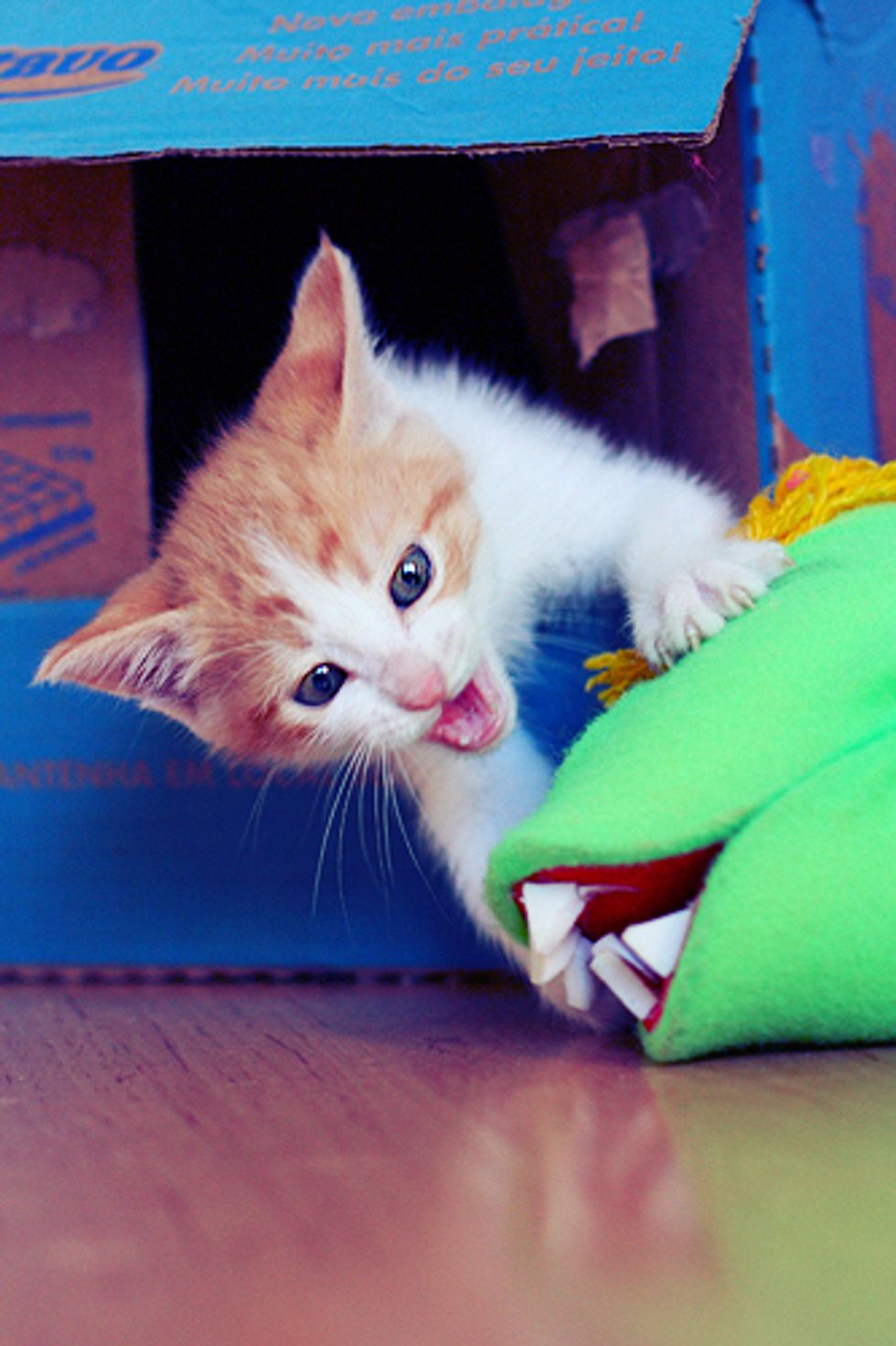 Meanwhile, another friend of Giane's, Rosi, found a little stray named Marcelinho who was wandering alone on the street in another town. Marilia offered to foster the little ginger and white kitten right away, but at first Madeleine was not very pleased with the new addition in the family and became very protective of her own kittens. There was always tension in the house and Marcelinho alienated himself from the litter. Giane and Marilia later decided to give Marcelinho a separate room to himself.