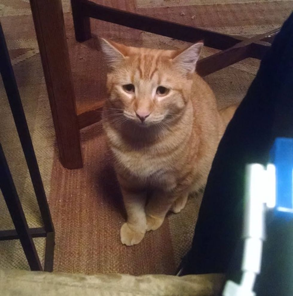 Marty the ginger cat bears an uncanny resemblance to Puss in Boots with his wide-eyed meek gaze.