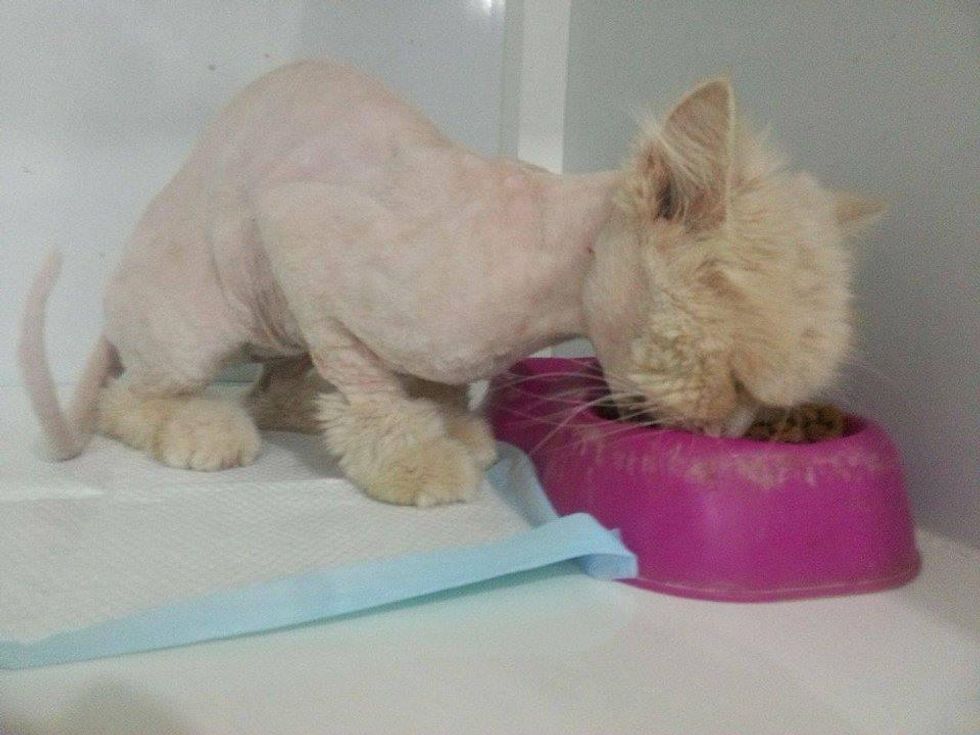 After getting a much-needed bath, Brian walked up to his food bowl and cleaned it up. He was given the all-you-can-eat-all-day kitty buffet as he needed to gain weight and get stronger.