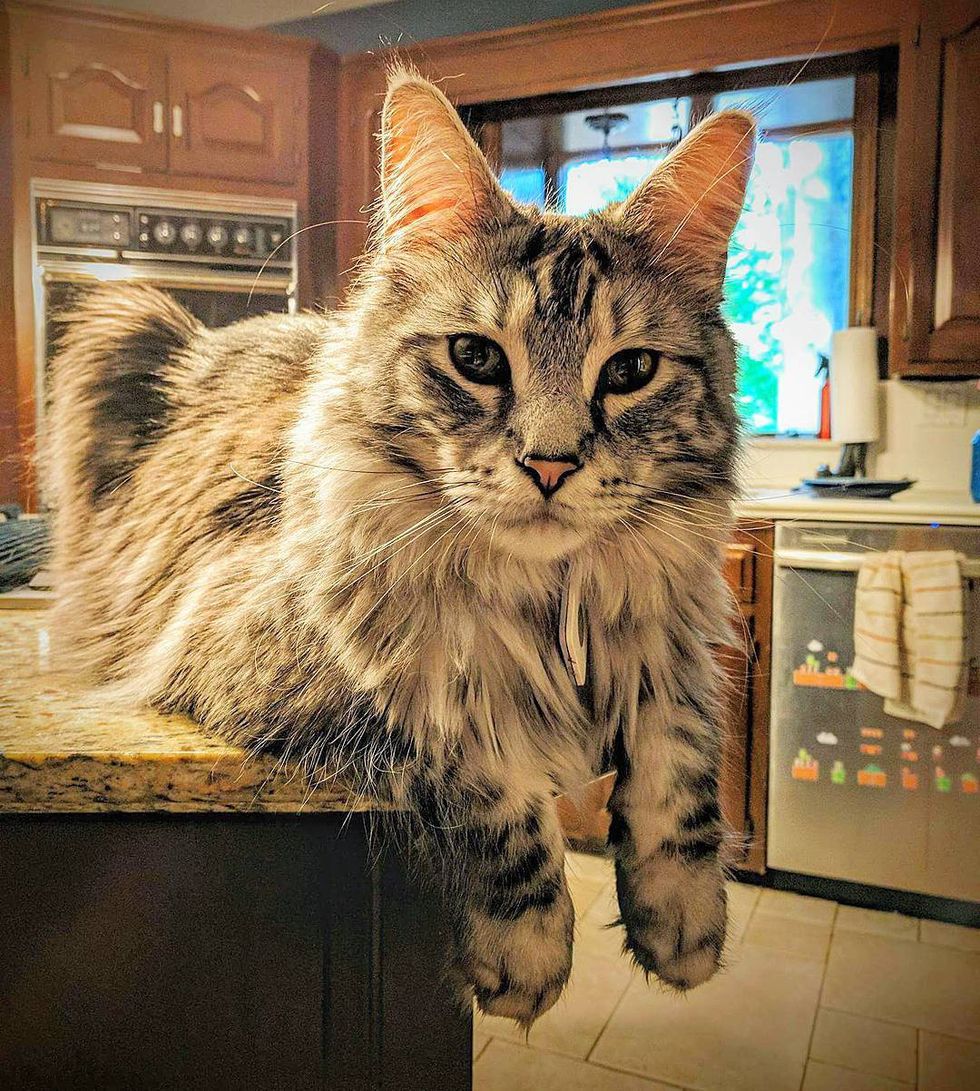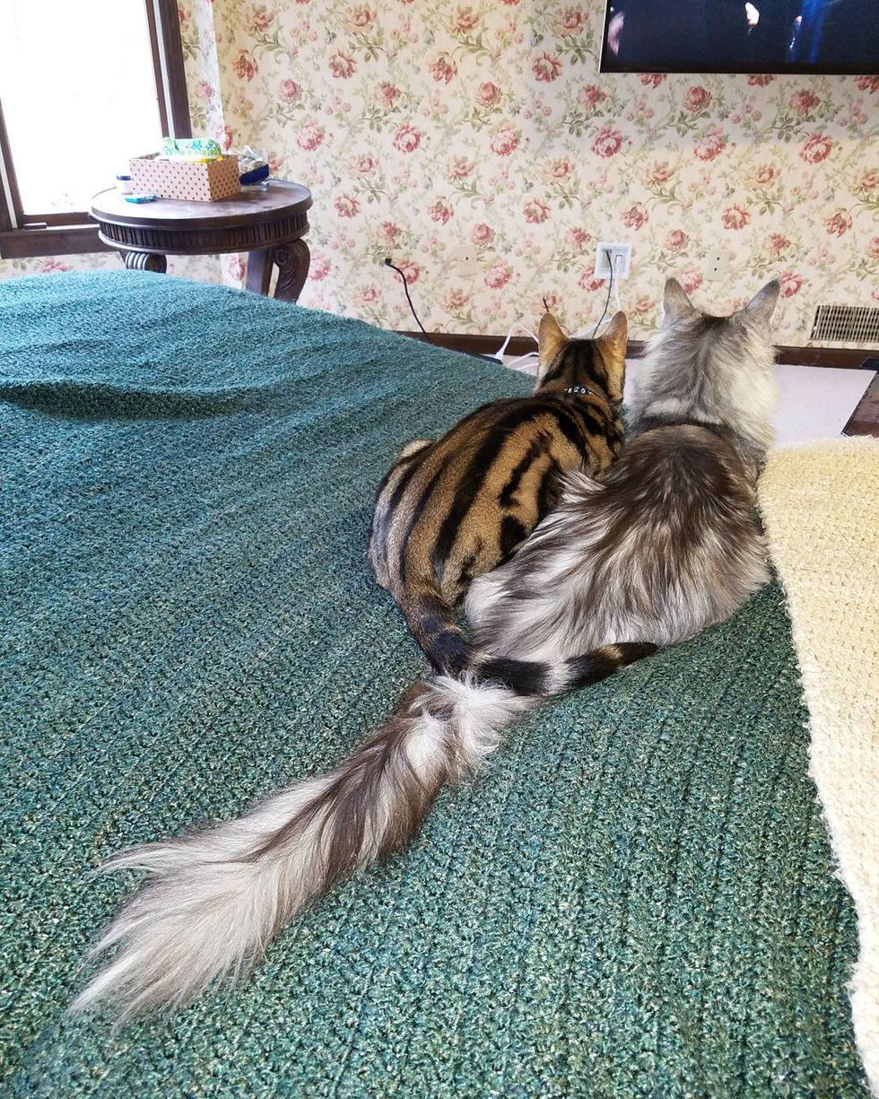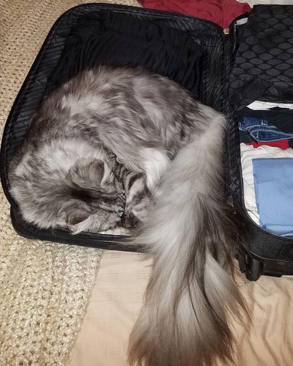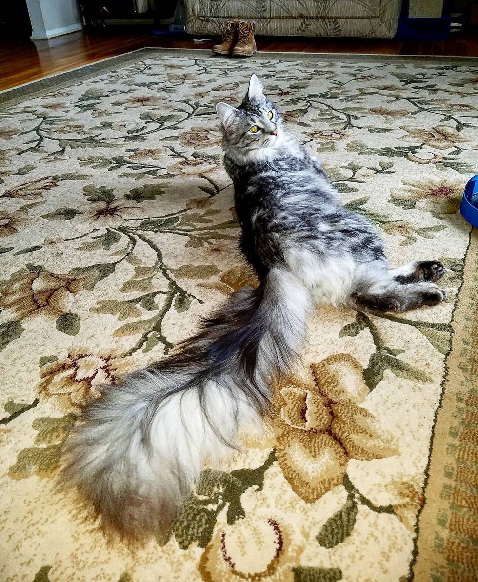 People often call the fluffy Maine Coon "Featherduster" or "Door draft blocker" as his tail is incredibly long and fluffy.