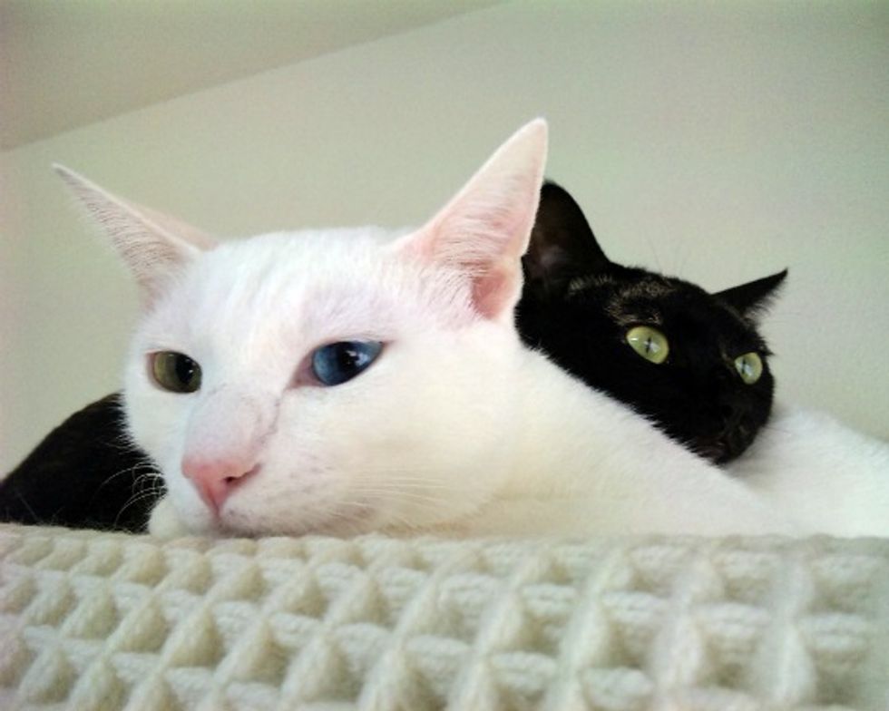 They watch the window TV together, hang out on the carpet with each other, snuggle with each other during nap time, and even cuddle affectionately on daddy's lap.