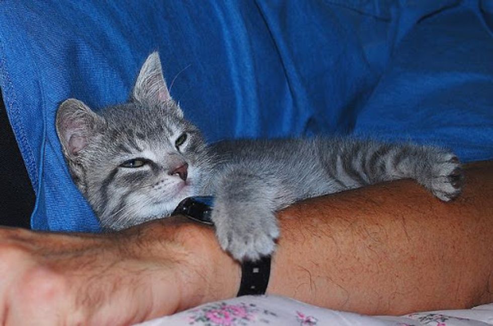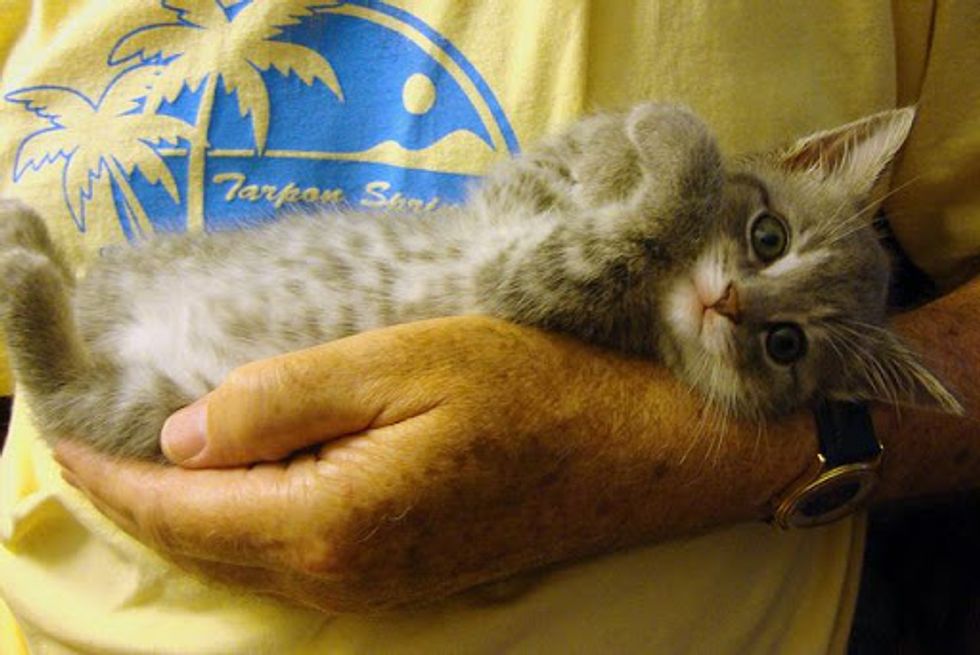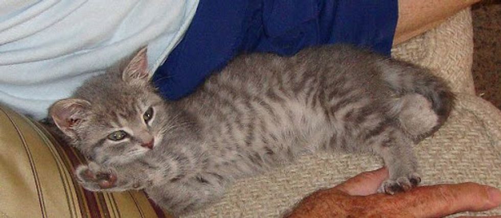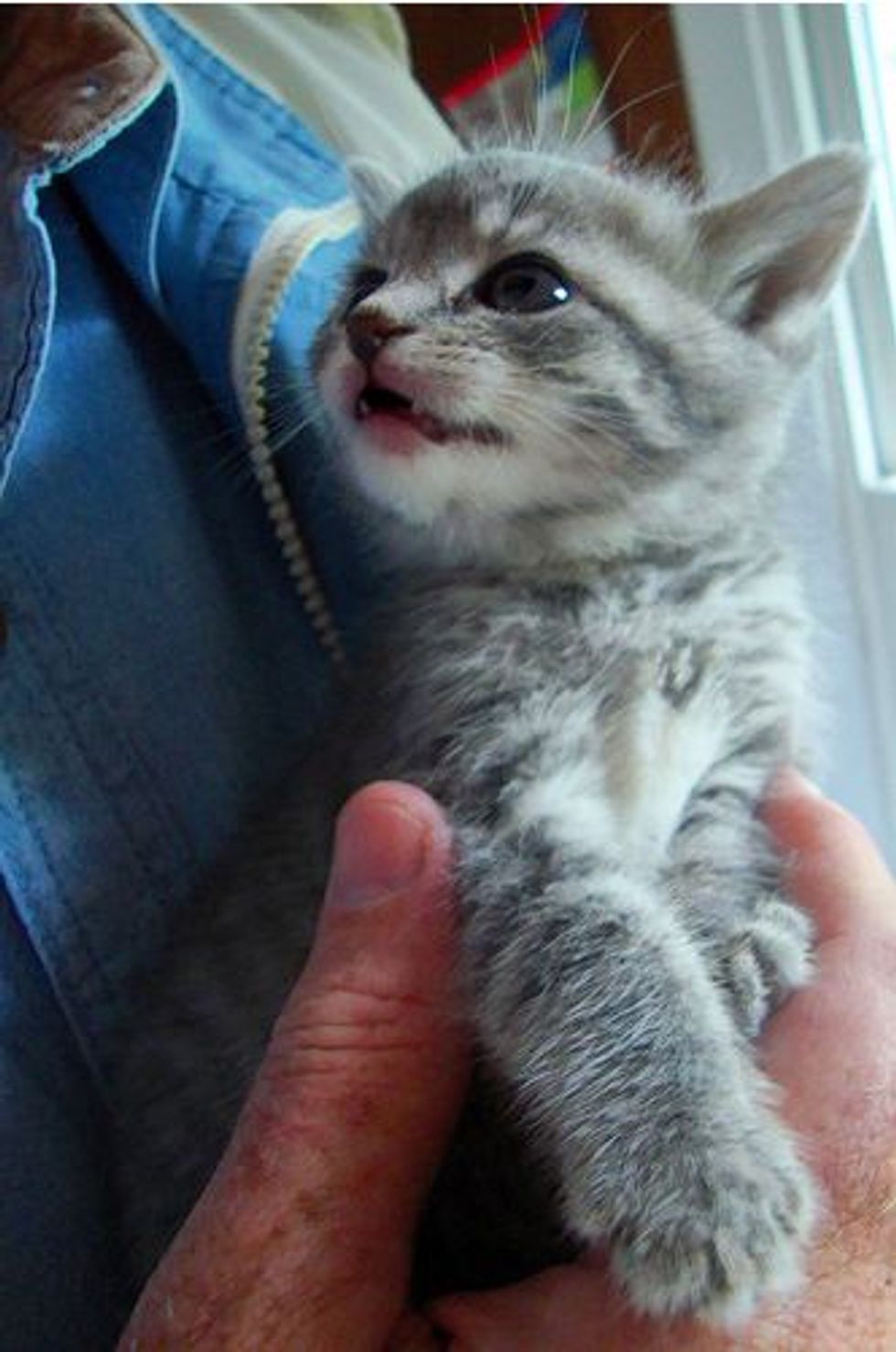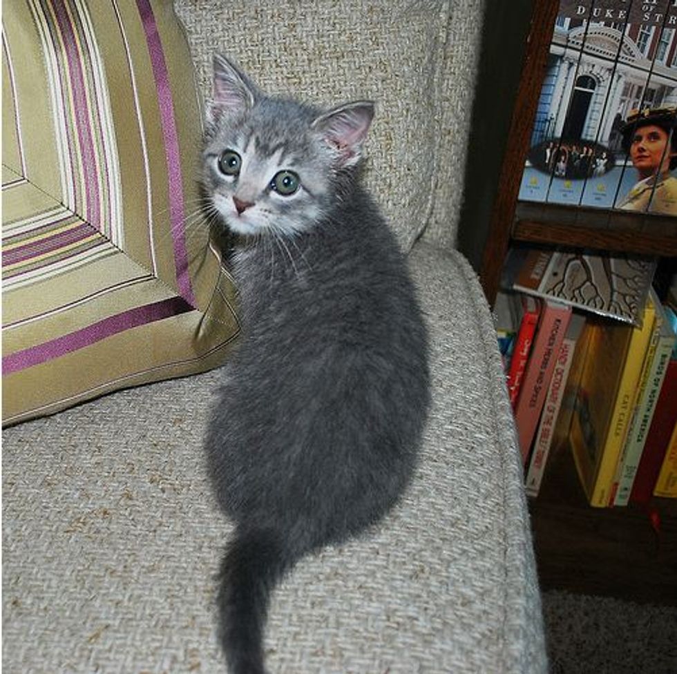 We brought Millie home on May 17, 2010. After I retired from teaching, I worked for 6 years at the local library. A group of those I worked with go to lunch monthly and one of those coworkers, our friend Heide, showed up at the May luncheon with photos of five orphaned kittens. Heide has always been active in finding homes for kitties (she has five of her own) and asked if any of those at the luncheon that day could provide a home to one or more of these adorable little cats. The next day we went to see the kittens. We were immediately drawn to a little gray one who reminded us of our dear Margo who died in 2005. Margo was a gray "dilute tabby" and it appeared that this was also the color of this new little girl. She has a distinct "M" on her forehead (more so than most tabbies) so we decided to call her "Millie."