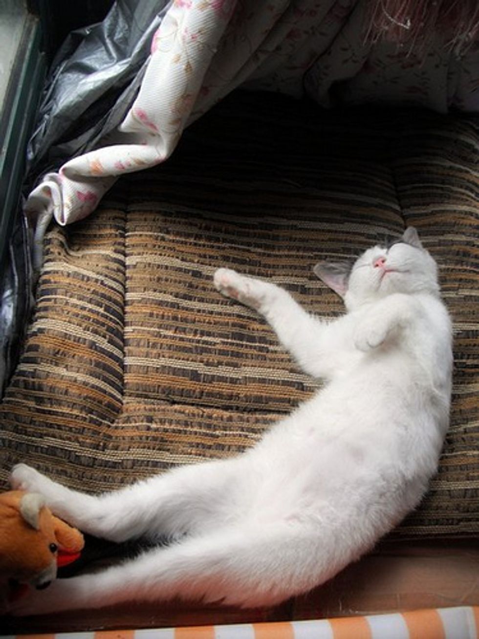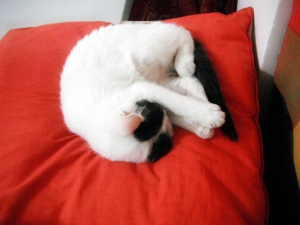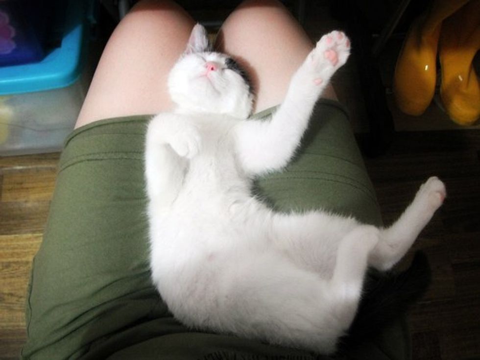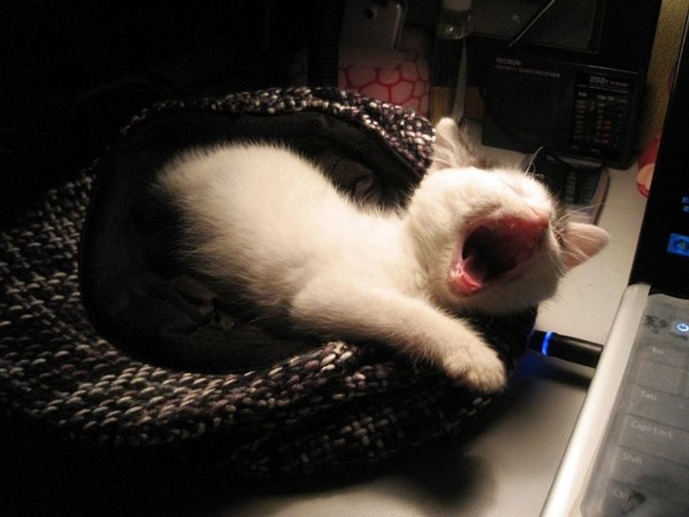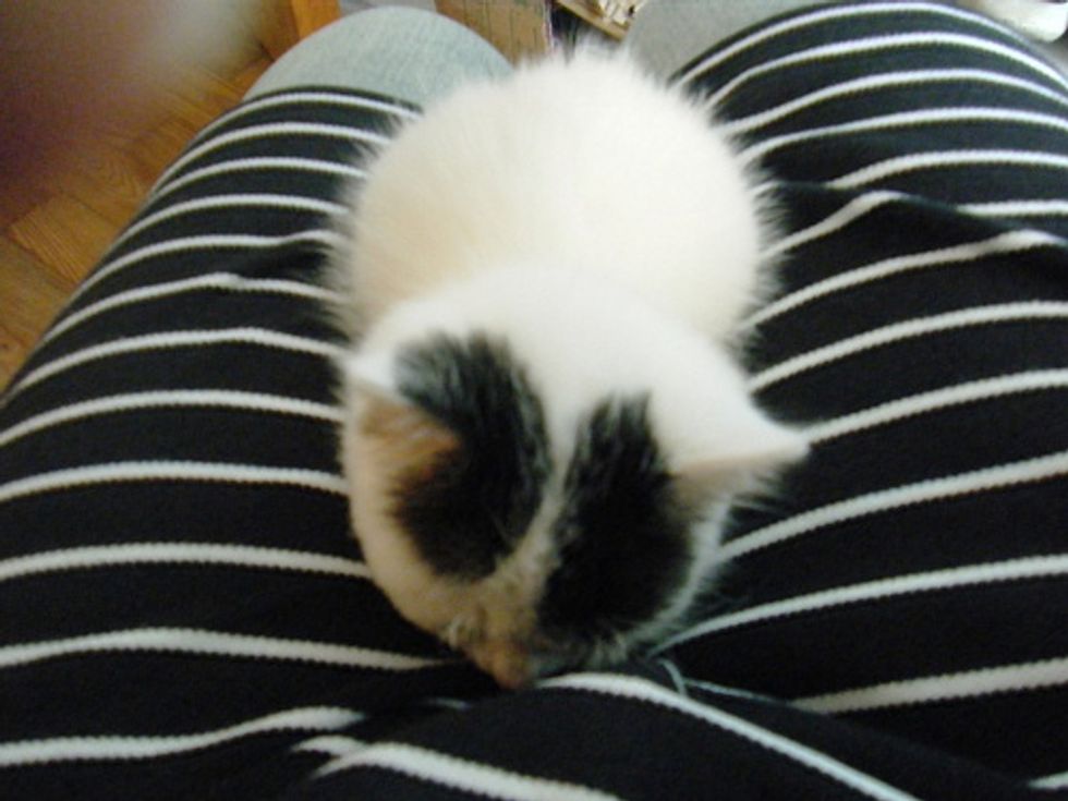 "I introduced little teddy, a stuffed animal to Mimi and she sniffed around it and then greeted it with a headbutt. Daddy made a temporary bed for her to nest in. She snuggled right in. When daddy used the computer, she stayed on his lap and fell asleep."