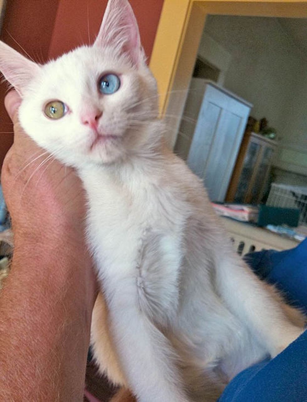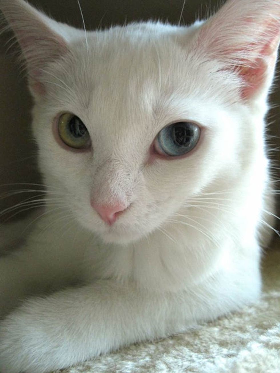 Mimo a beautiful odd-eyed white kitty was born to a feral cat that was rescued by Craig Street Cats. She may be partially deaf, but that doesn't stop her from being a little ball of energy that she is.