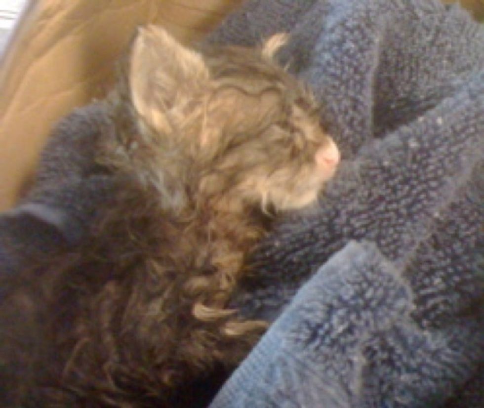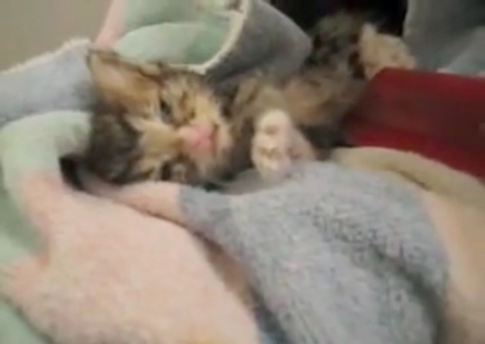 After a quick bath and picking off about 60 fleas, the tiny kitten began to meow faintly. They set her up with a heating pad and blanket and constantly massaged her to keep her blood flowing.