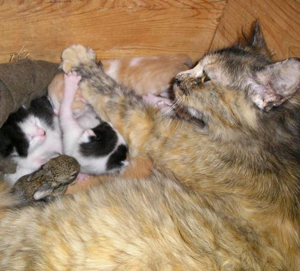 A mom cat, who gave birth to a litter of kittens, adopted a few orphans rescued from the wild. They are tiny baby bunnies. "The mom of these wild rabbits left them but they were lucky enough to be adopted by mom cat," said Marta.