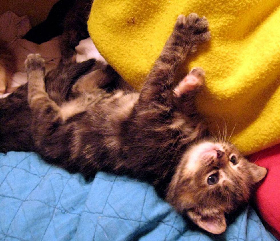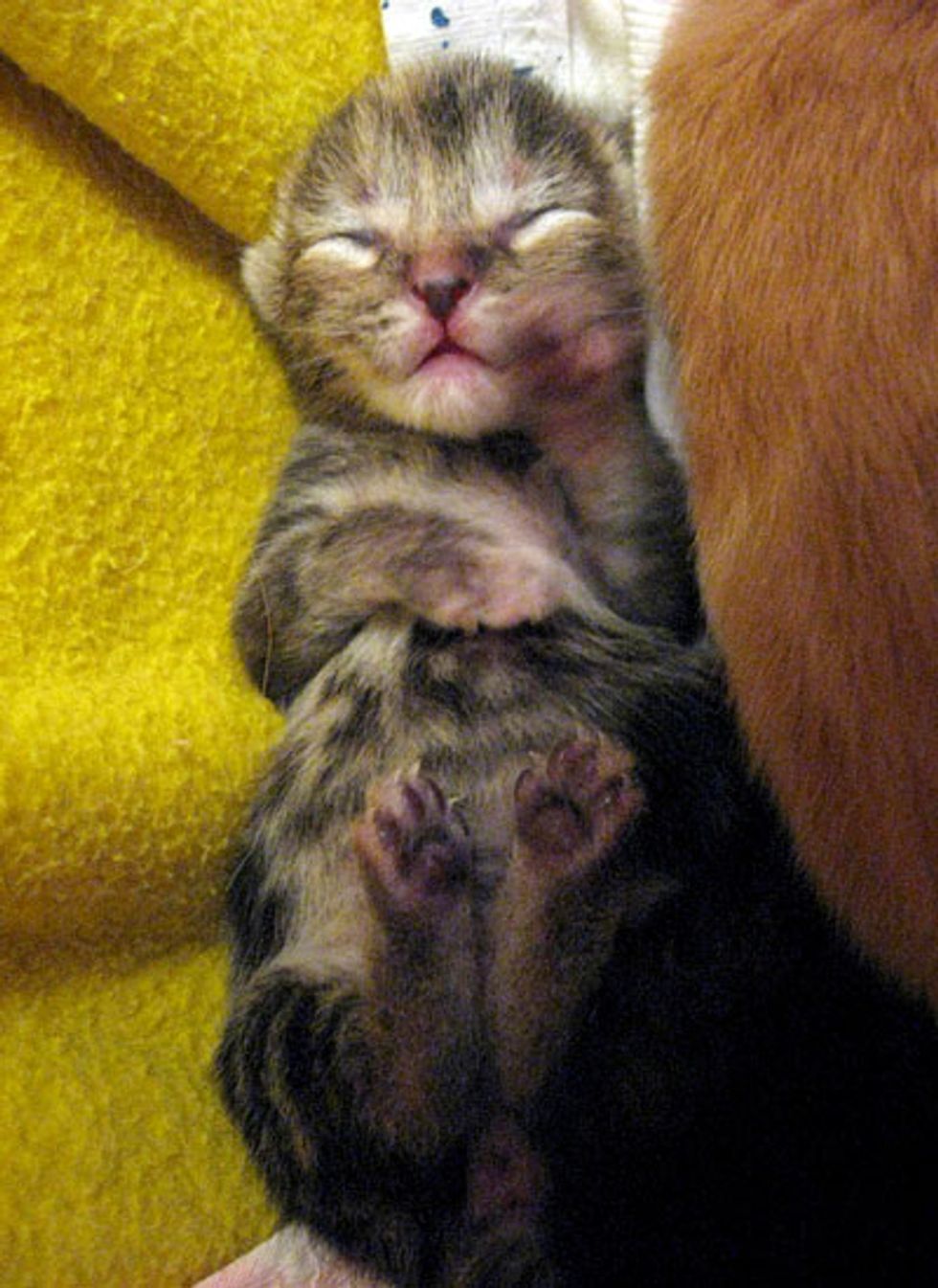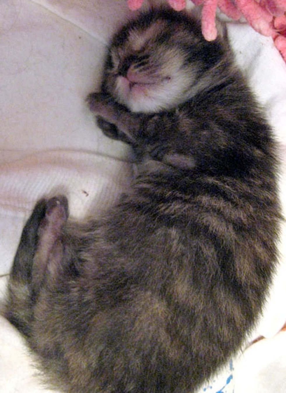 Momo (previously named Moe) is one of the rescued kittens born to a feral cat mama. "It appears that all of the kittens are female rather than 'boys' - we're not sure yet, but we're changing Moe's nickname to "Momo", which is Japanese for "Peach" - a nickname which works whether male or female," said Elyce Feliz.