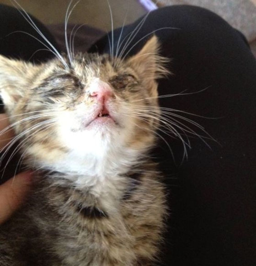 2 months ago, on the day he was found. "His eyes and nose were completely matted shut with mucous and dirt and he was barely 1 pound. Skin and bones and absolutely no energy. The first week was bottle feedings and vet visits."