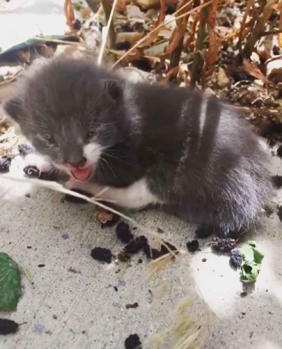 A tiny kitten was discovered in a backyard meowing loudly for her cat mother who was nowhere to be found. Her pitiful cry caught the attention of the home owner. When they found her, they were surprised to see just how small she was.