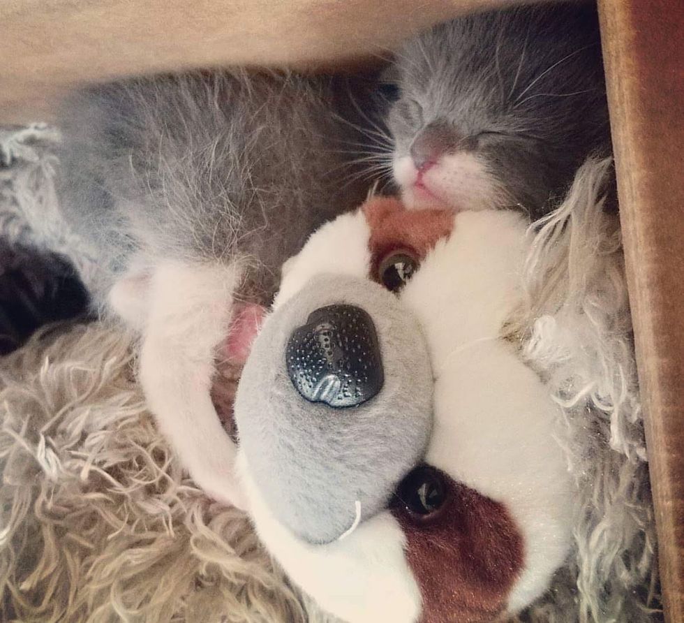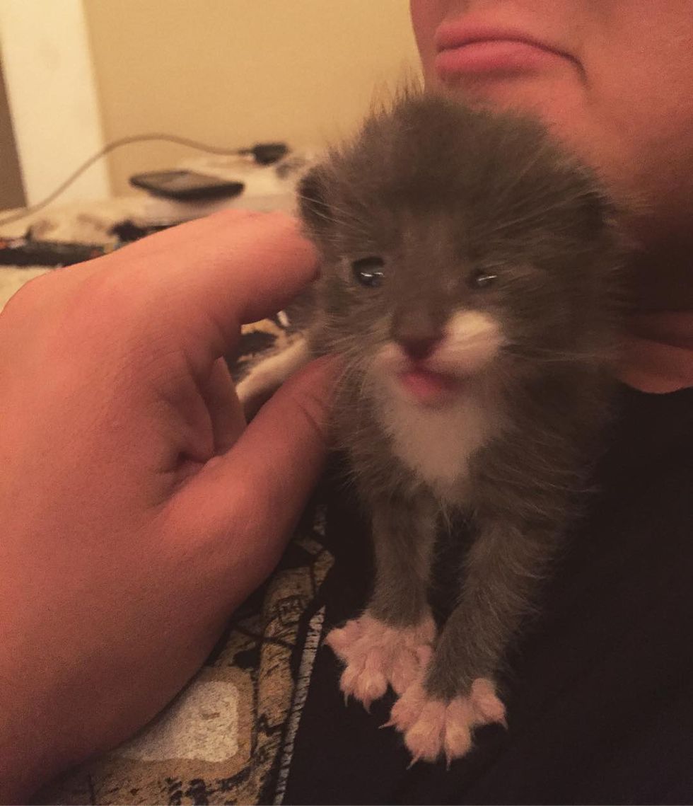 "This was the first night that we picked her up. Her eyes weren't open all the way and she meowed until we held her and fed her."