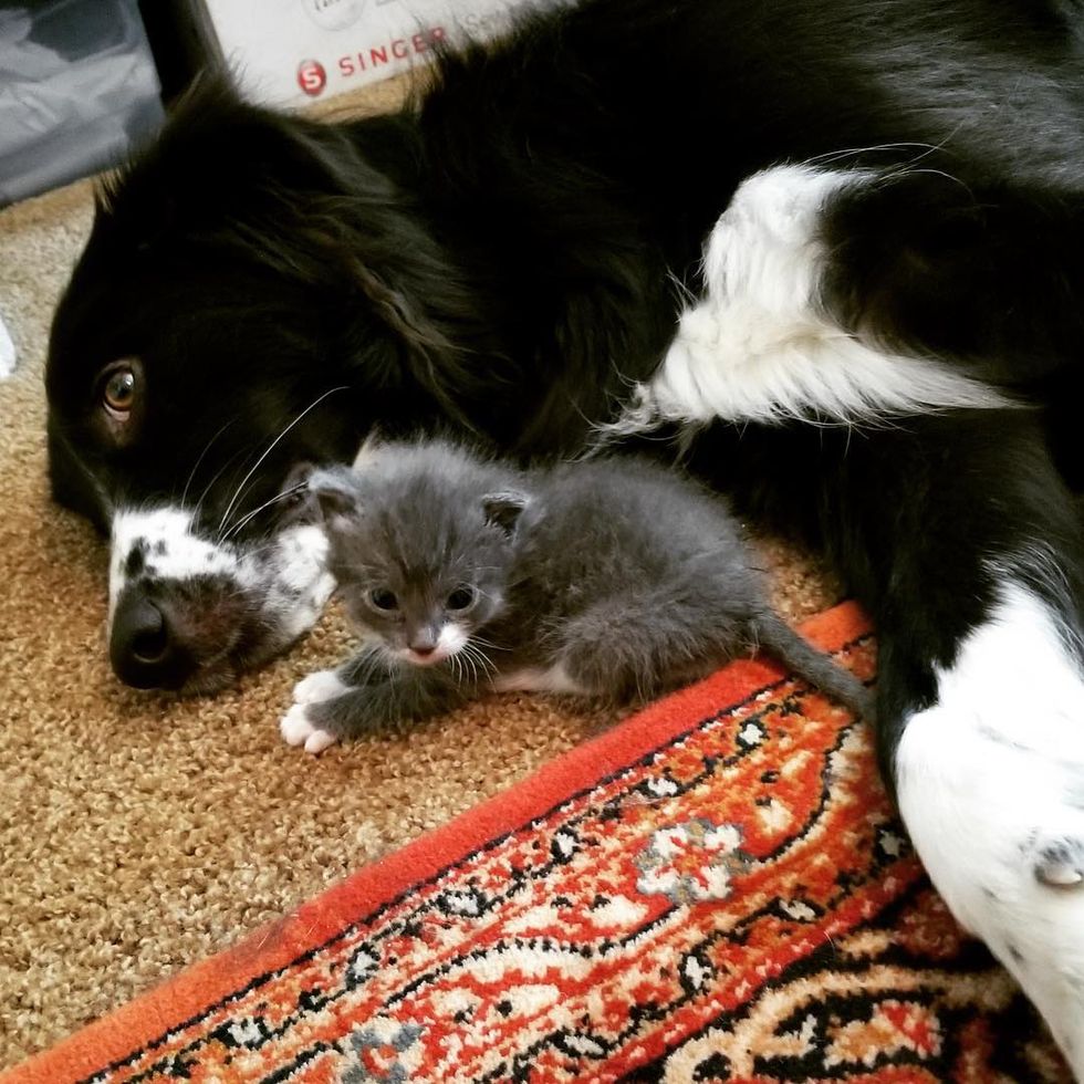 Sassy was nursed back to health with some help from a loyal canine friend. Molly took to Sassy on the day they met and has been very protective of her kitten ever since.