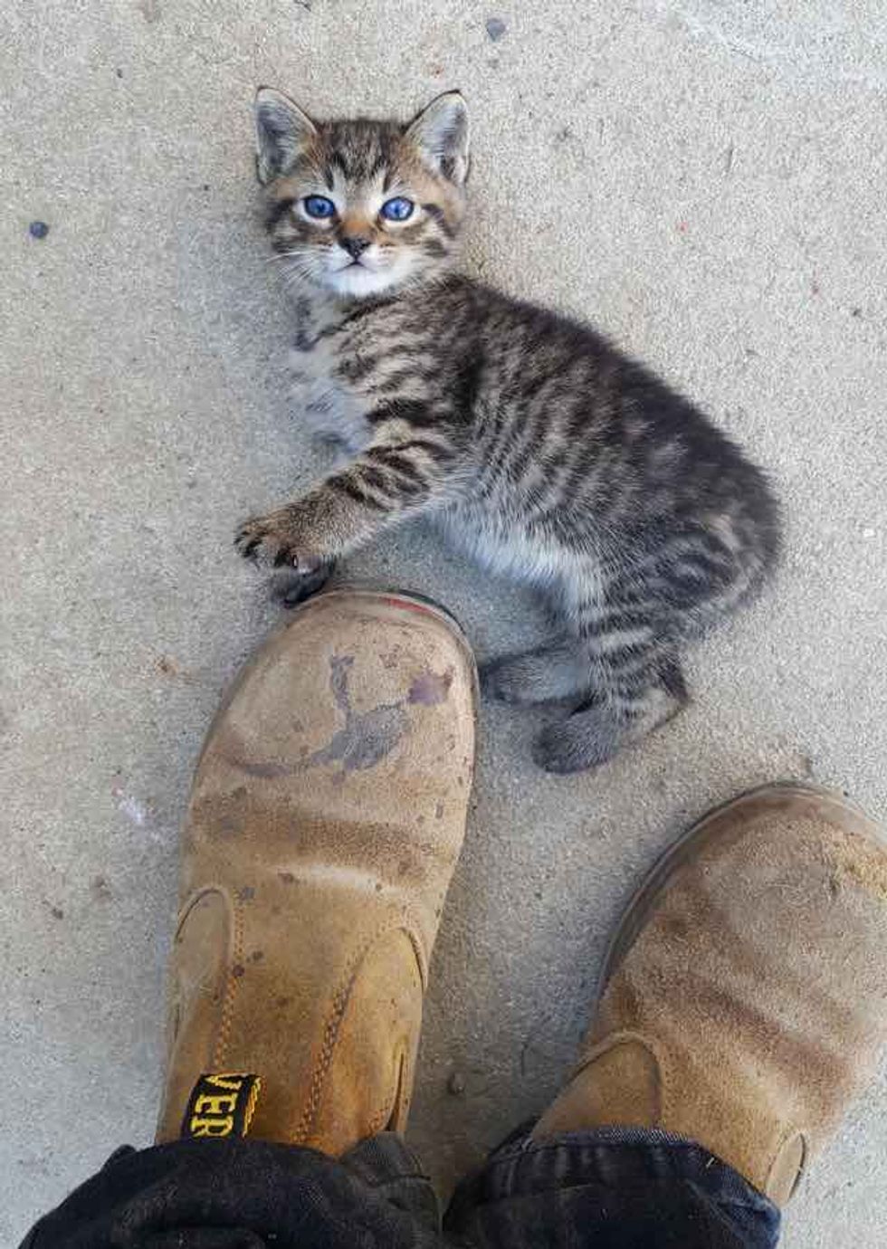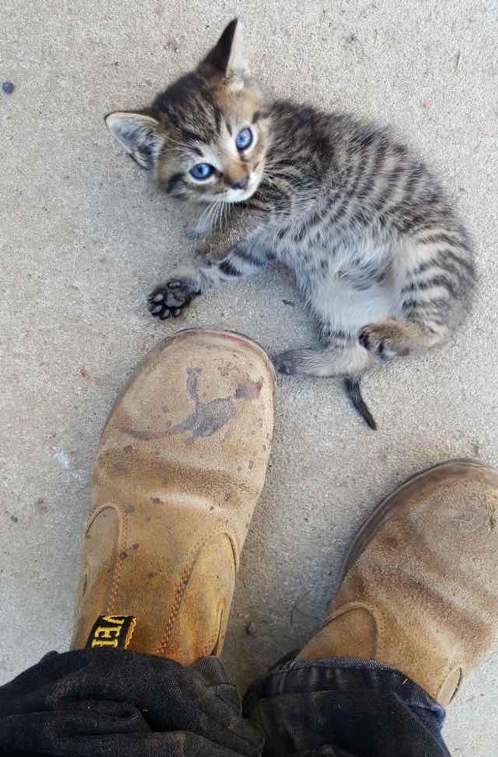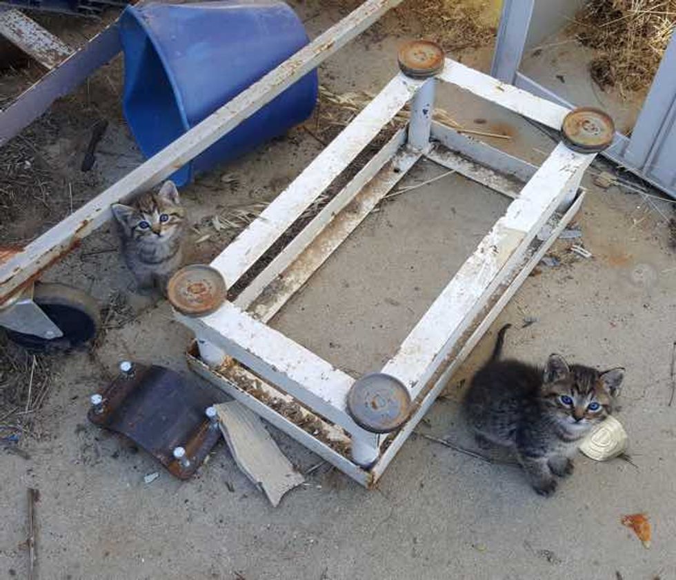 Two little motherless kittens walked up to a father and son in a scrapyard, looking for help...