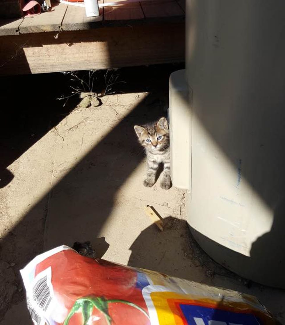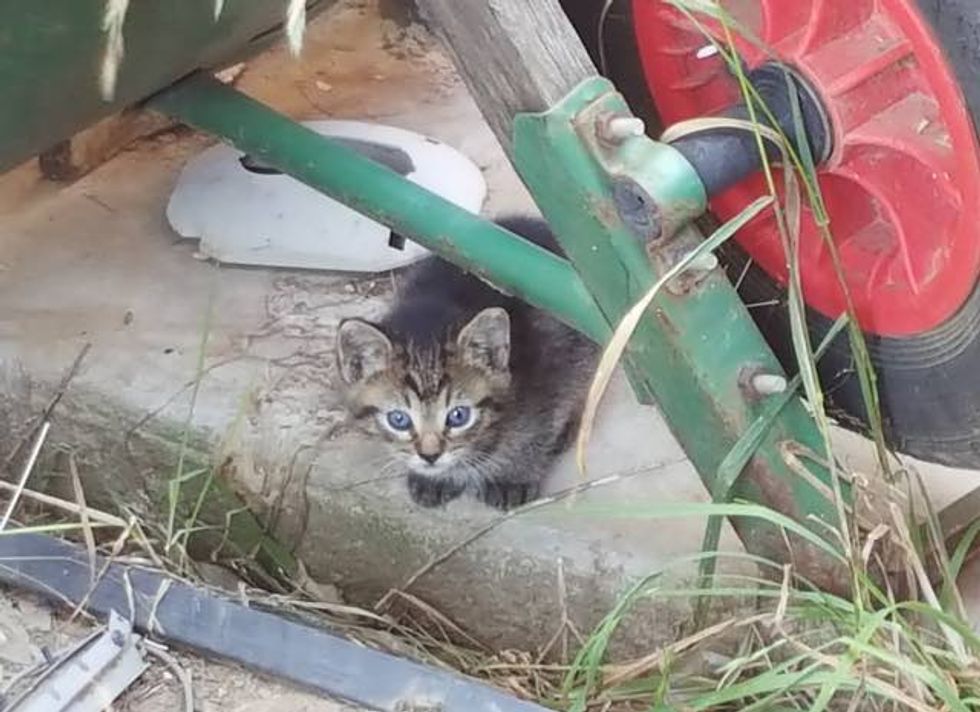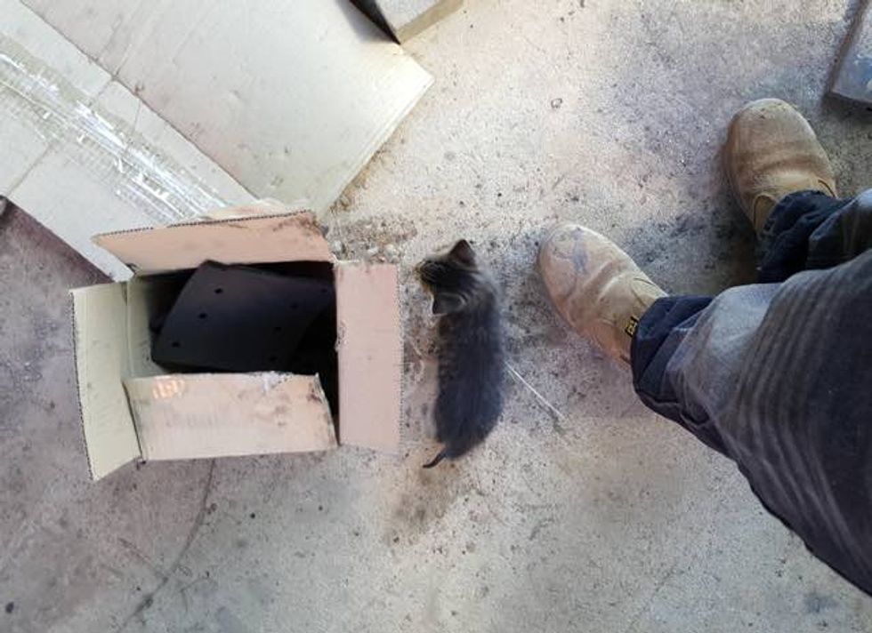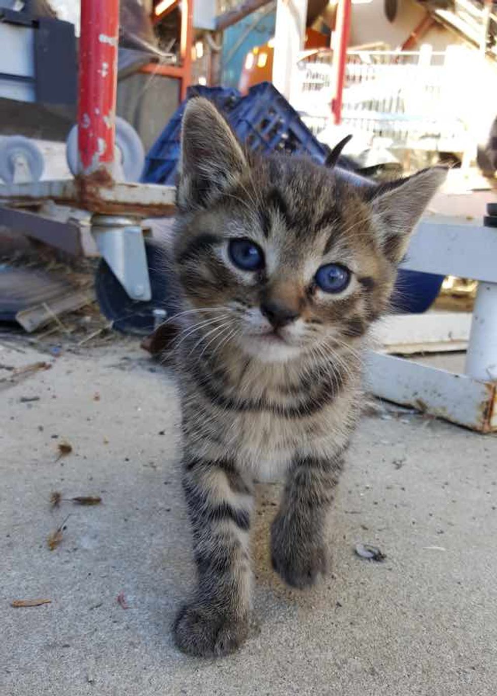 Two little motherless kittens walked up to a father and son in a scrapyard, looking for help...