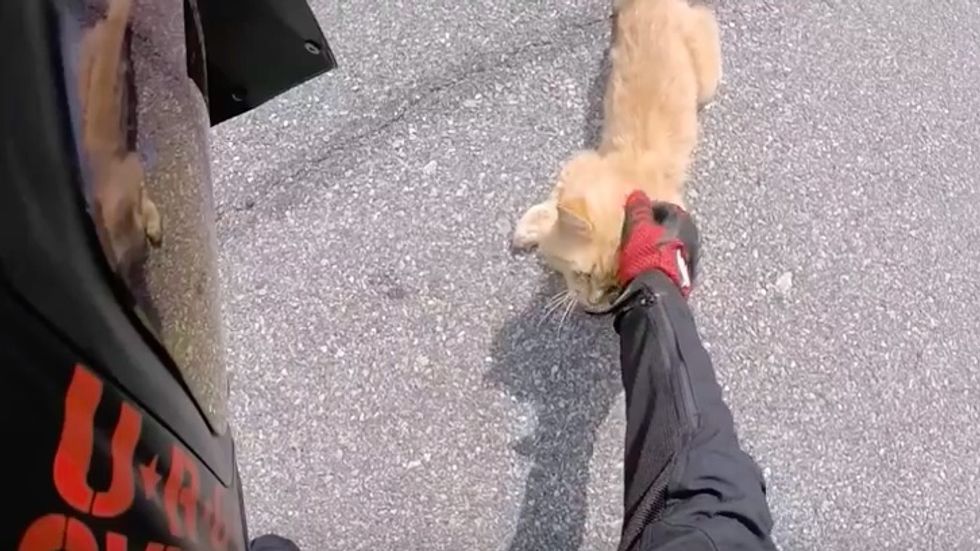 A motorcyclist found a stray cat lying in the middle of the mountain road. He did everything he could to try to save him.