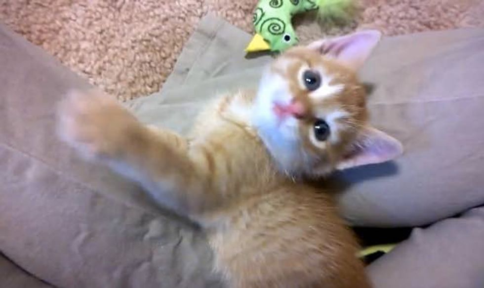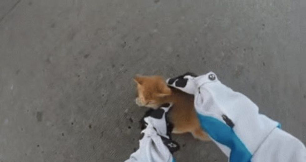 The kitten was taken to the vet after the incident. "All is good, he is 4 weeks old - 1lb. Has ringworm that he is getting treatment for. Slight scabby on his foot, but dealing fine. Skids is a trooper!"